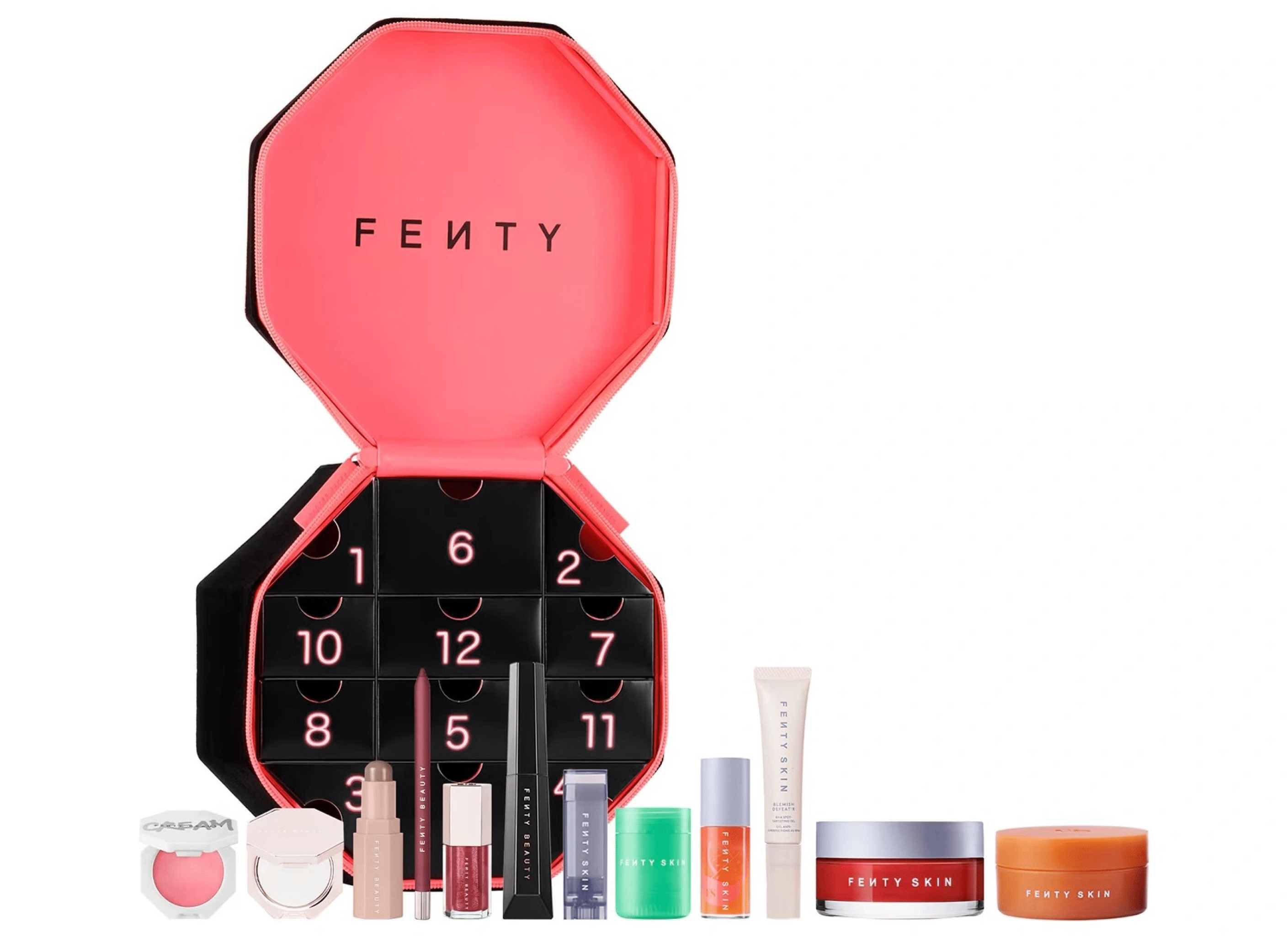 С 2017 года Fenty не перестает радовать максимально продуманным ассортиментом. Уходовые и мейкап-средства дают возможность девушкам с самыми разными типами внешности создавать красивые образы и заботиться о себе. Адвент из коллекции бренда Рианны собран с глубоким пониманием того, что нужно каждый день. В наборе 12 продуктов из линий Beauty и Skin — для макияжа и ухода за кожей. Среди бестселлеров — мини-версия контурного стика Match Stix, блеск Gloss Bomb Riri, а также насыщенные румяна Cheeks Out и крем для тела Butta Drop с ароматом соленой карамели. Что приятно, 8 средств представлены не в миниатюре, а в полноразмерном формате. Продукты помещены в стильный восьмигранный бокс в черном цвете с ярко-розовыми деталями и крышкой на молнии. Косметика скрывается в пронумерованных выдвижных коробочках. С таким подарком легко сиять, как бриллиант, и в праздники, и после них.