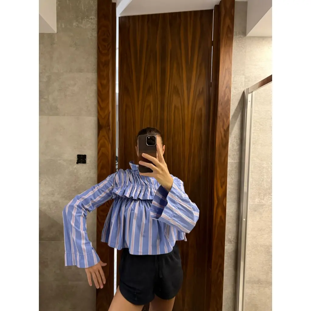 Топ блузка Очень стильная Сзади на 3 пуговицы застежка Удлиненный рукав Очень приятная, лёгкая , натуральная ткань В новом состоянии , надевалась пару раз