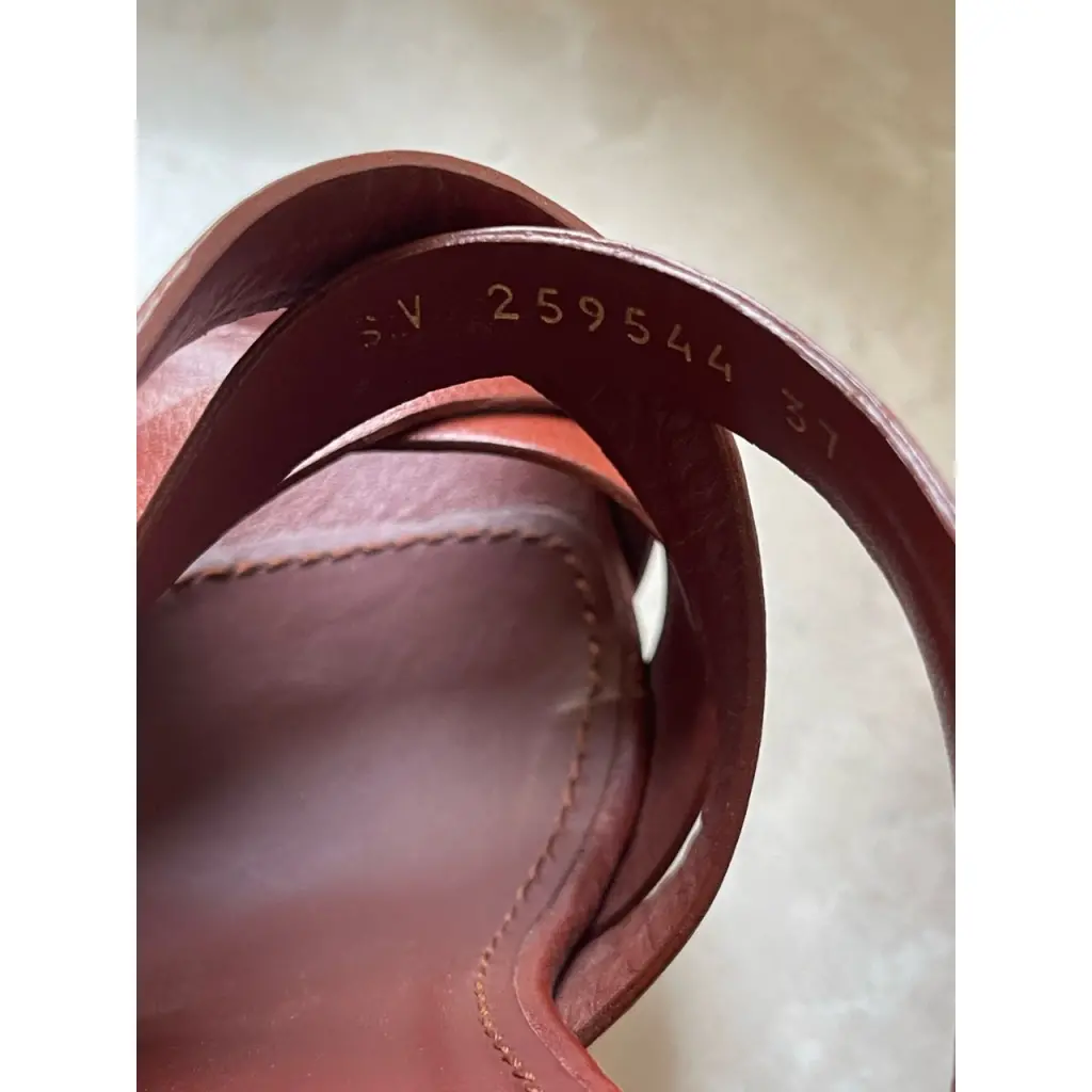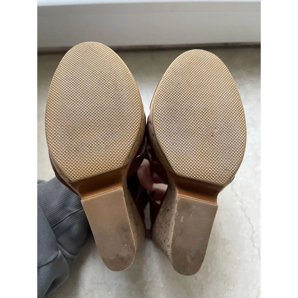 Босоножки из коричнево-бордовой кожи с пробковым каблуком-танкеткой в золотые вкрапления. Босоножки Yves Saint Laurent имеют перекрестный ремешок, открытый носок, вырез на подошве и золотую пряжку на щиколотке. Стильные и очень удобные в носке. Носились 1-2 раза.