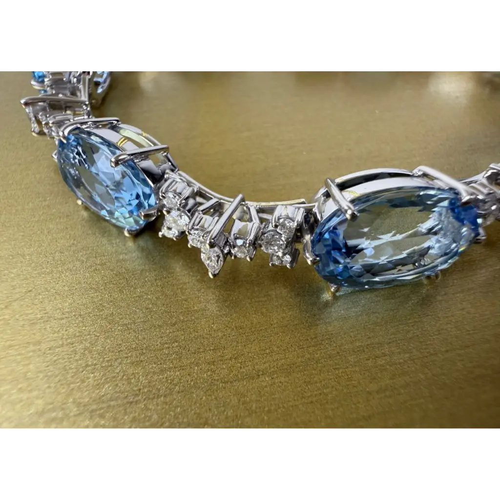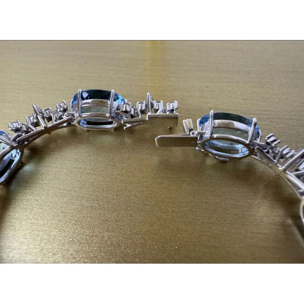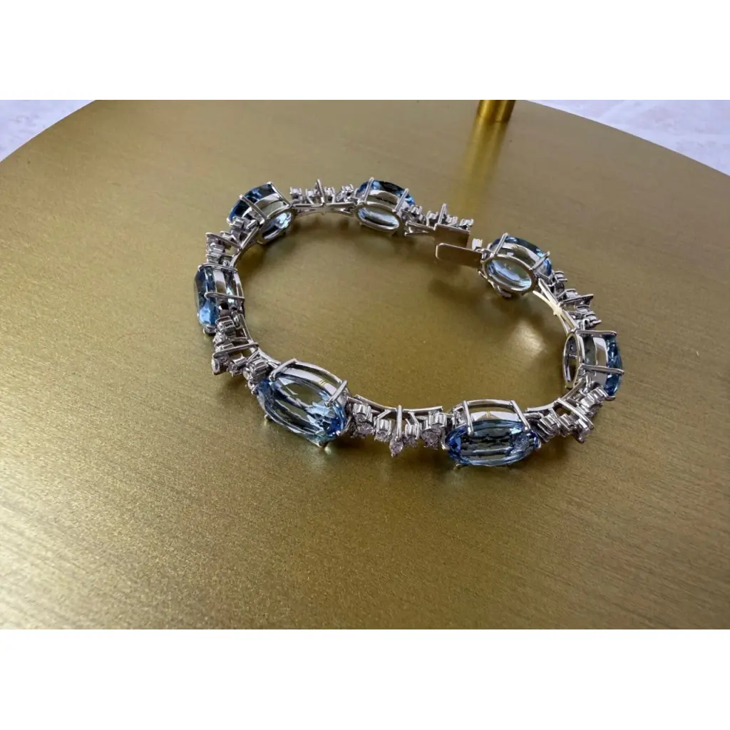 Неподвластный времени браслет H.Stern выполненный из белого золота 750 пробы с вставкой из 7 аквамаринов общей массой 24,5 ct.. а также с 56 бриллиантами классической формы огранки массой 1,65 ct., а также с 7 бриллиантами формы огранки "Маркиз" массой 0,35 ct. Длина браслета - 18,0 см. Вес - 25,47 гр.
