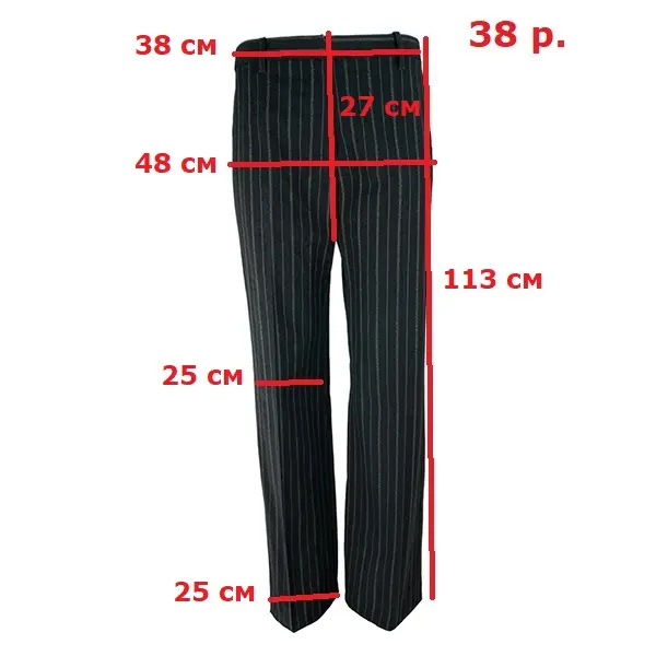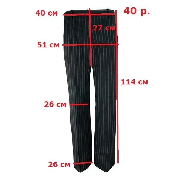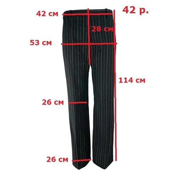 Брюки классические средней посадки, прямые широкие от бедра, вертикальный рисунок в белую полоску, ширинка на молнии спереди, боковые прорезные карманы сзадм - на пуговице. Материал: шерсть 59%, хлопок 41% Производитель: Анн Демеульеместер Бельгия.