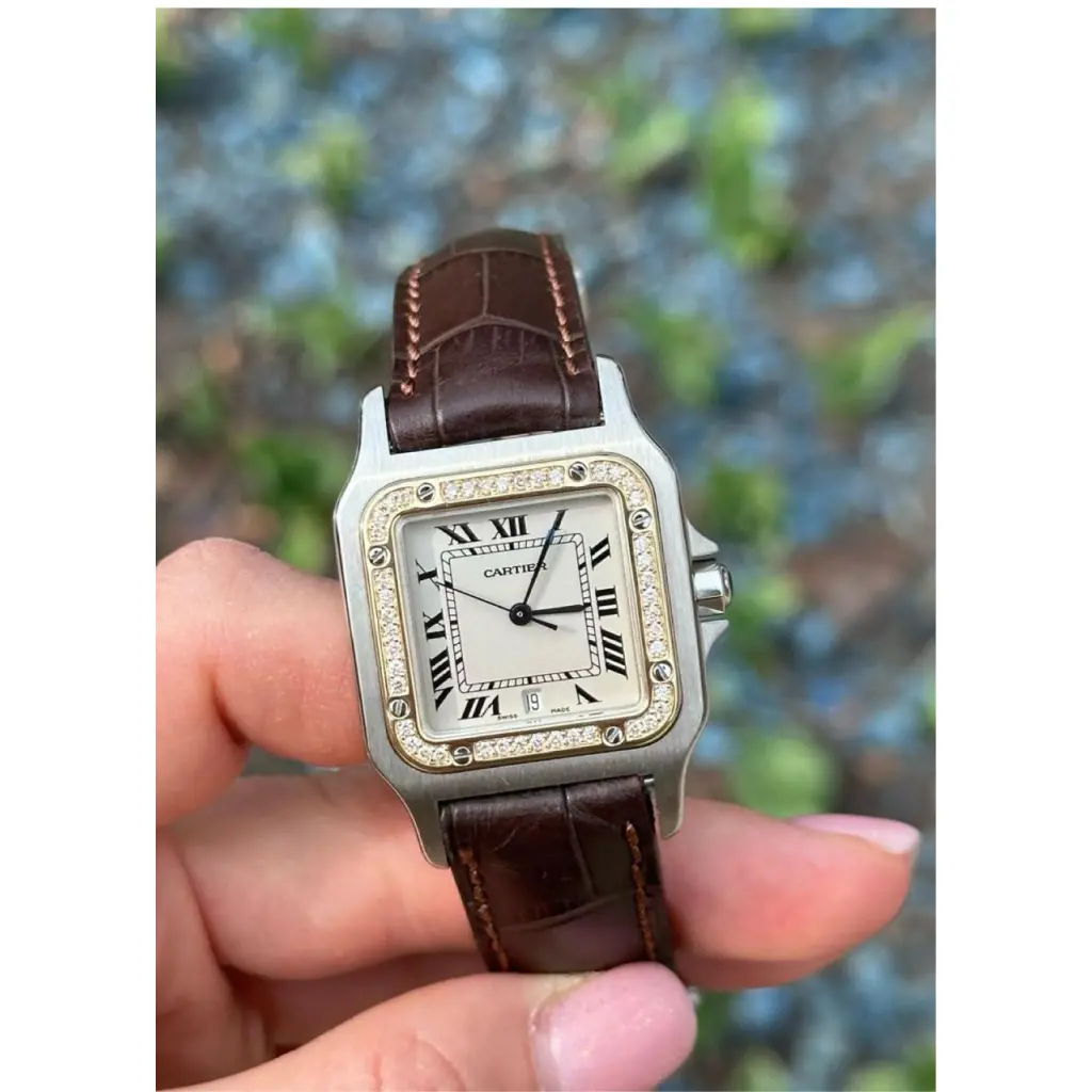 Cartier santos 2013 года 29 мм,сталь /золото ,инкрустированы бриллиантами ,ремешок заменен на Rios ,но пряжка клипса оригинал .Без каких либо царапин и прочего,прекрасная инвестиция,подарок,позиция в коллекцию