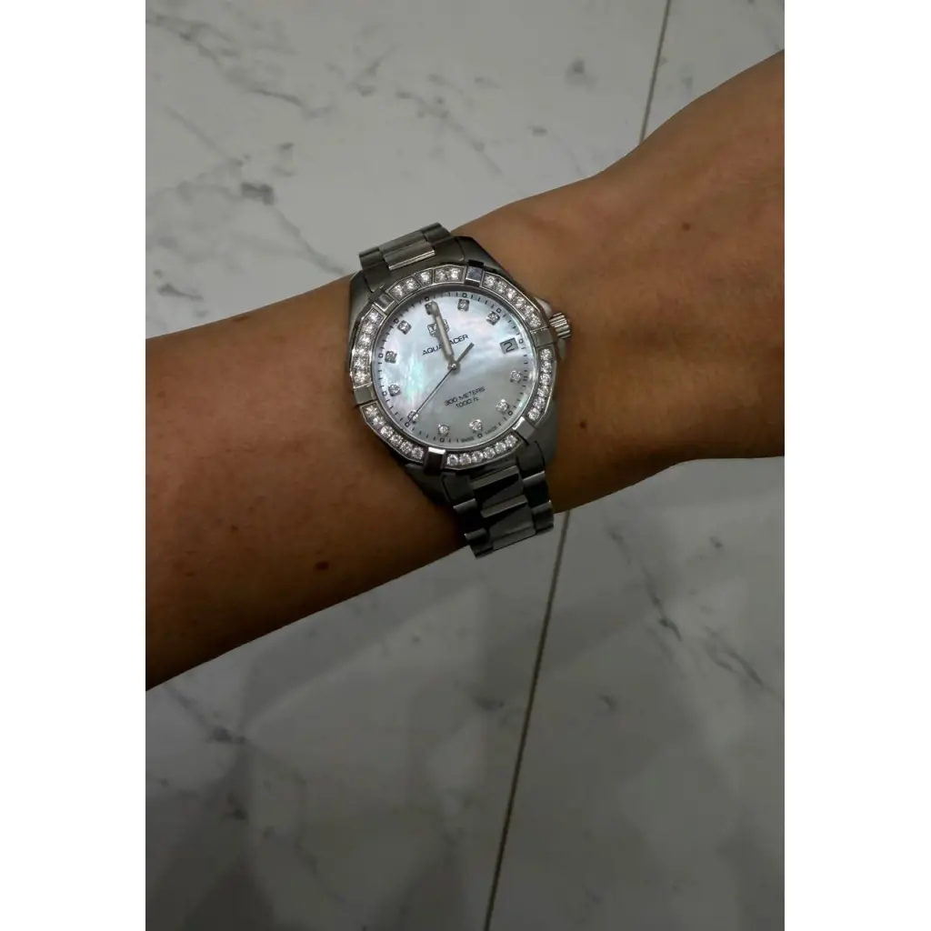 Циферблат из натурального перламутра. Инкрустация 11 бриллиантов VS диаметром 1,4 мм и общим весом 0,11 карата в качестве часовых индексов, аппликация эмблемы TAG Heuer и стрелки покрытием родием, ювелирной огранкой и глянцевой полировкой. Светящееся в темноте покрытие люминофором Superluminova стрелок и разметки циферблата.