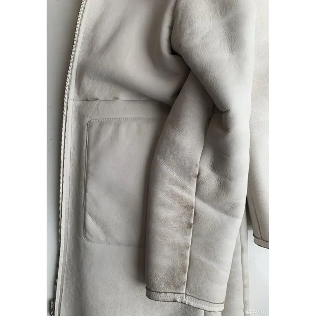 Дубленка двухсторонняя можно носить на обе стороны, кожа -ширлинг. Цвет чуть голубоват не совсем белый. Внутренние рукава чуть протерлись.
