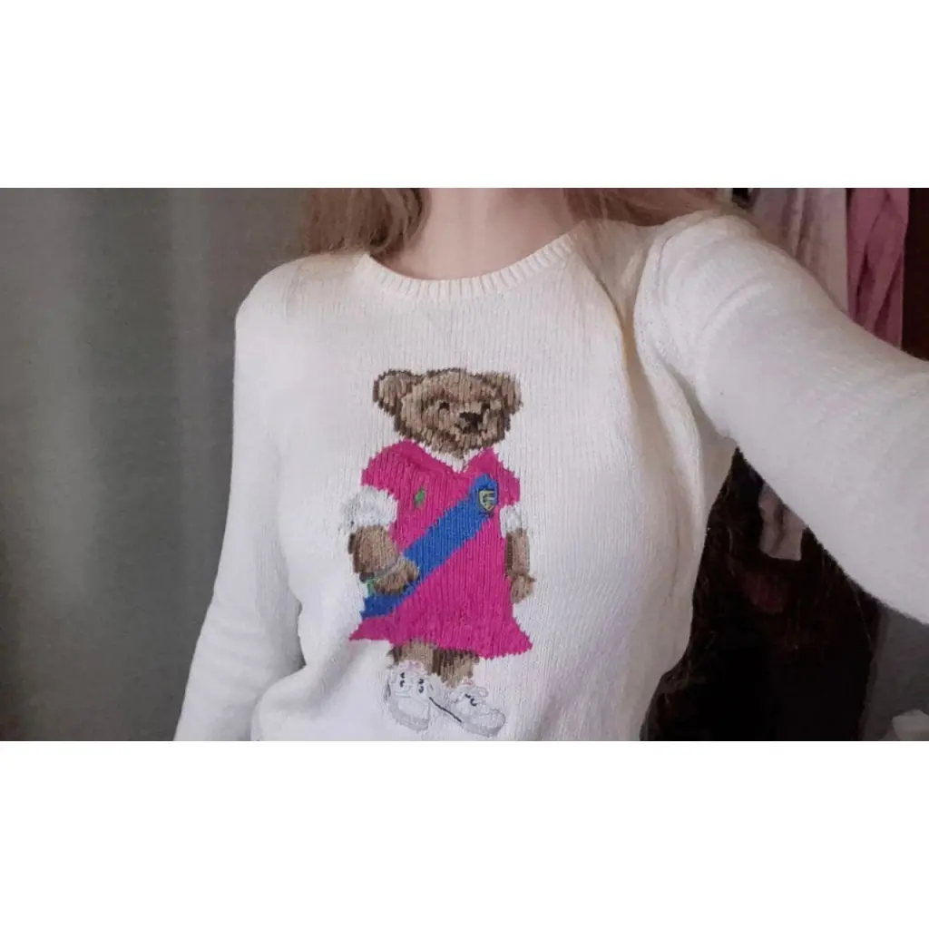 Свитер Polo Ralph Lauren bear молочного цвета с вышивкой медведя. Очень милый, нежный и женственный. К тому же в тренде 🙌Состав - хлопок 100%. Носился и стирался, не новый, но в отличном состоянии. Размер подростковый xl, носила на свой русский 40-42 и рост 170, сидит просто супер) Замеры: ширина груди 45, ширина плеч 38, длина по спине 52, длина рукава 58.