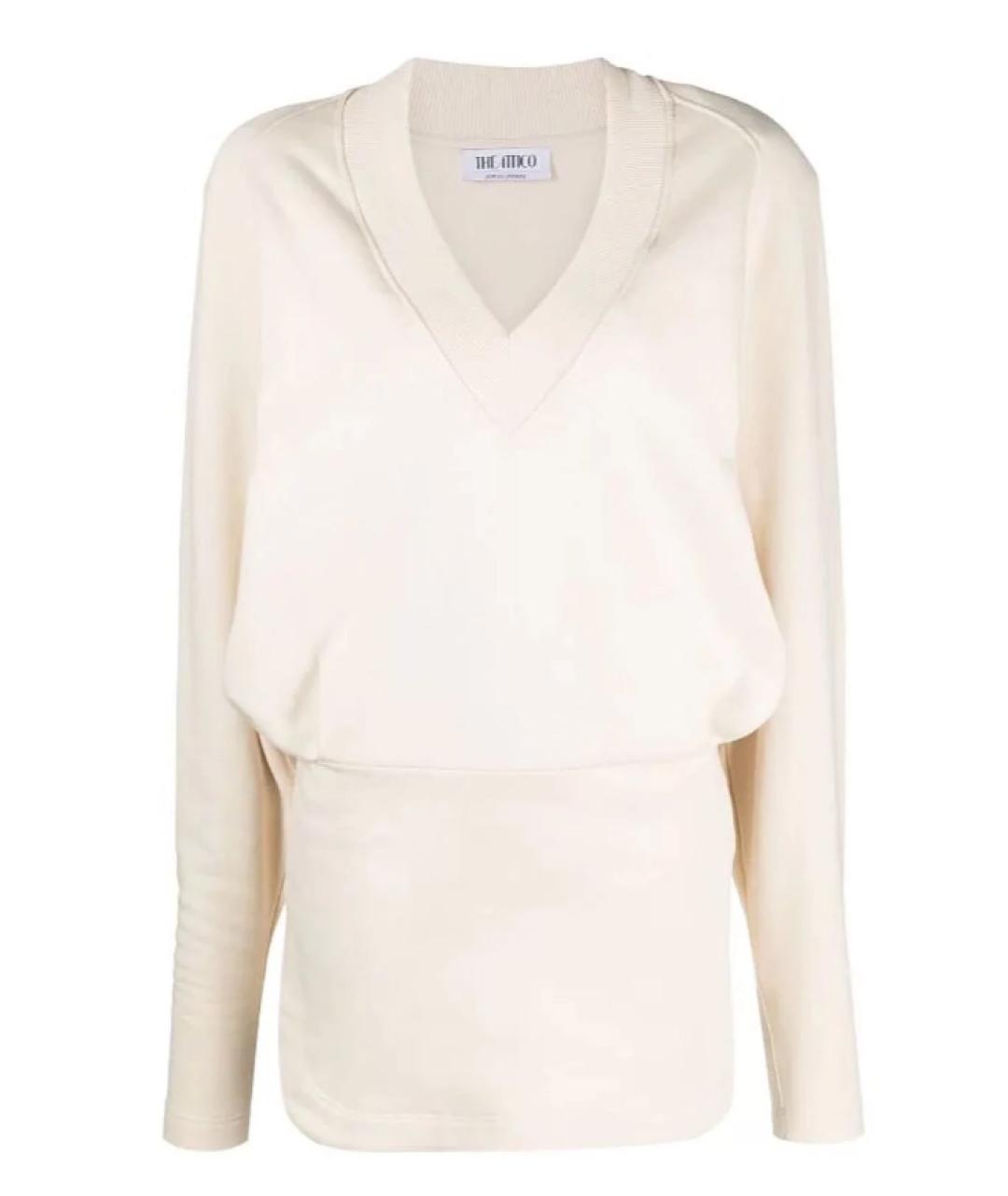 Удлиненный пуловер из шерсти коричневого цвета The Attico. Молоный удлиненный пуловер ‘Bequiri’ от Attico. Этот фасон, изготовленный из шерсти, отличается V-образным вырезом, завышенными плечами со съемной подкладкой, длинными рукавами и ажурными деталями из ребристого трикотажа по низу и манжетам.
