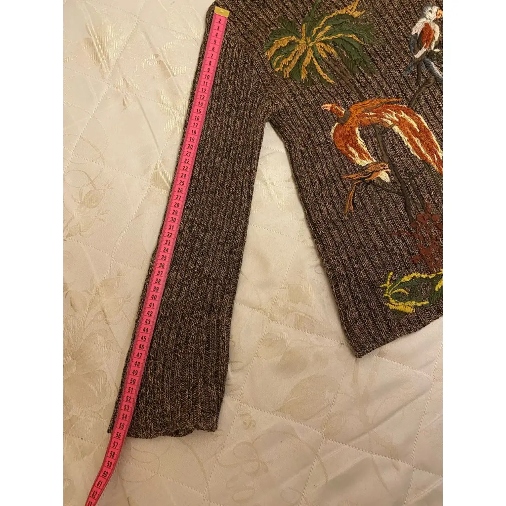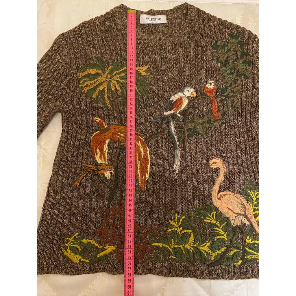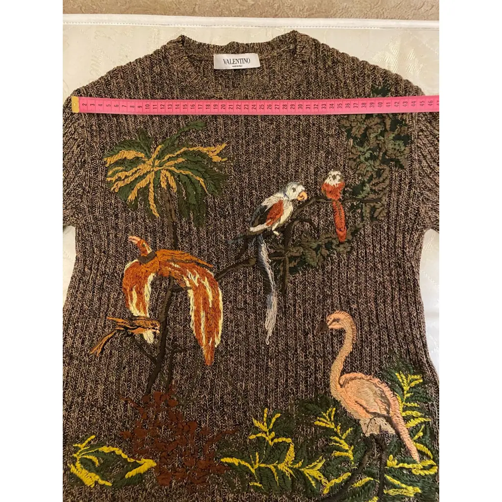 Коричневый свитер из временно-летней коллекции марки, основанной Valentino Garavani, украшен спереди разноцветной вышивкой в виде тропических птиц и растений.