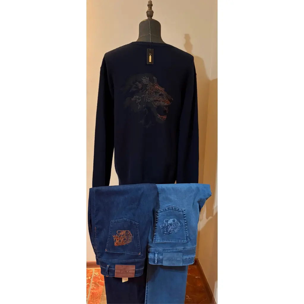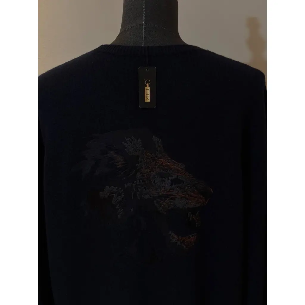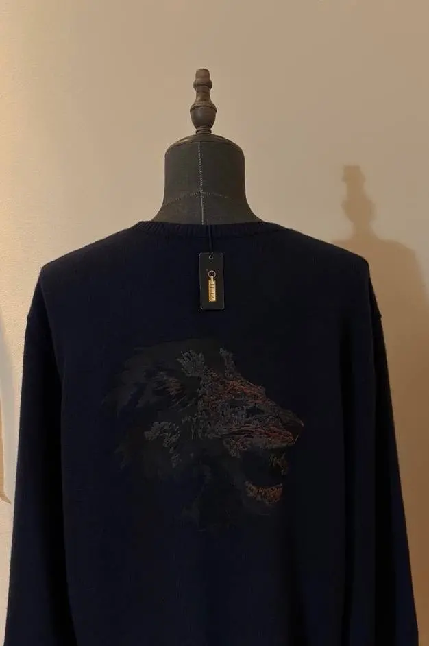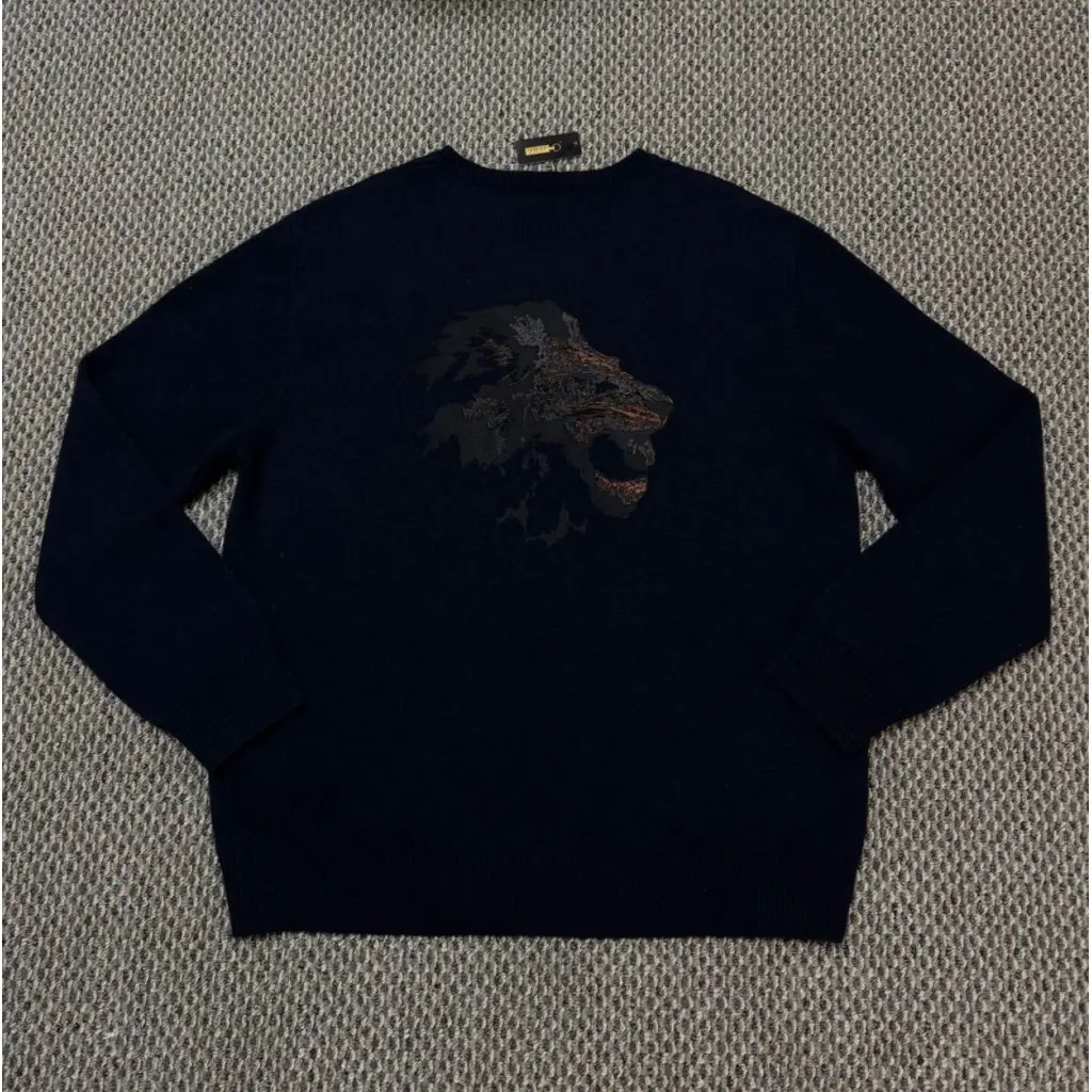 Темно-синий свитер из осенне-зимней коллекции выглядел бы просто, если бы не декор. Модель украсили фактурной вышивкой в виде головы льва, выполненной шелковистыми разноцветными нитями.