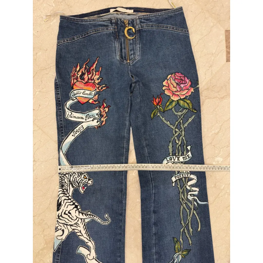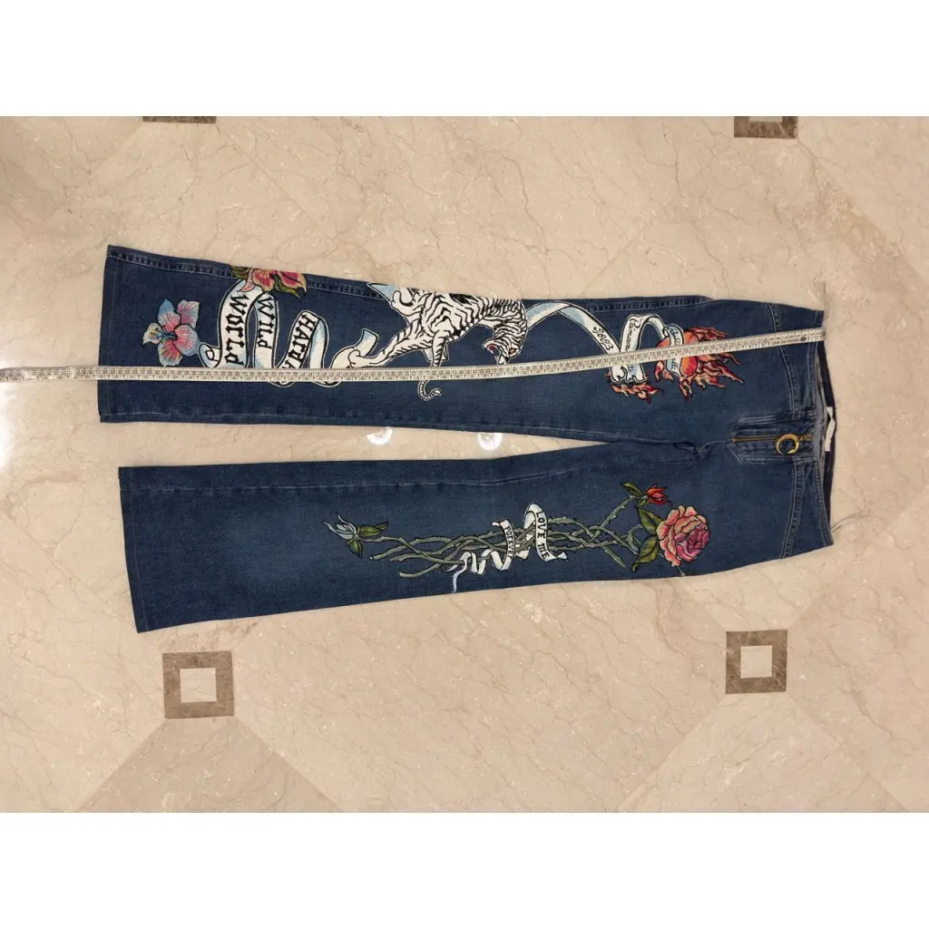 Стильные расклешенные джинсы с низкой посадкой, спереди молния с металическим золотым логотипом. Все расшиты вышивкой, белые элементы тигр и ленты из кожи. Были хитом коллекции весна 2003 года. Покупала в бутике в Милане. Одевала пару раз. В таких джинсах вы не останетесь не замеченной.)