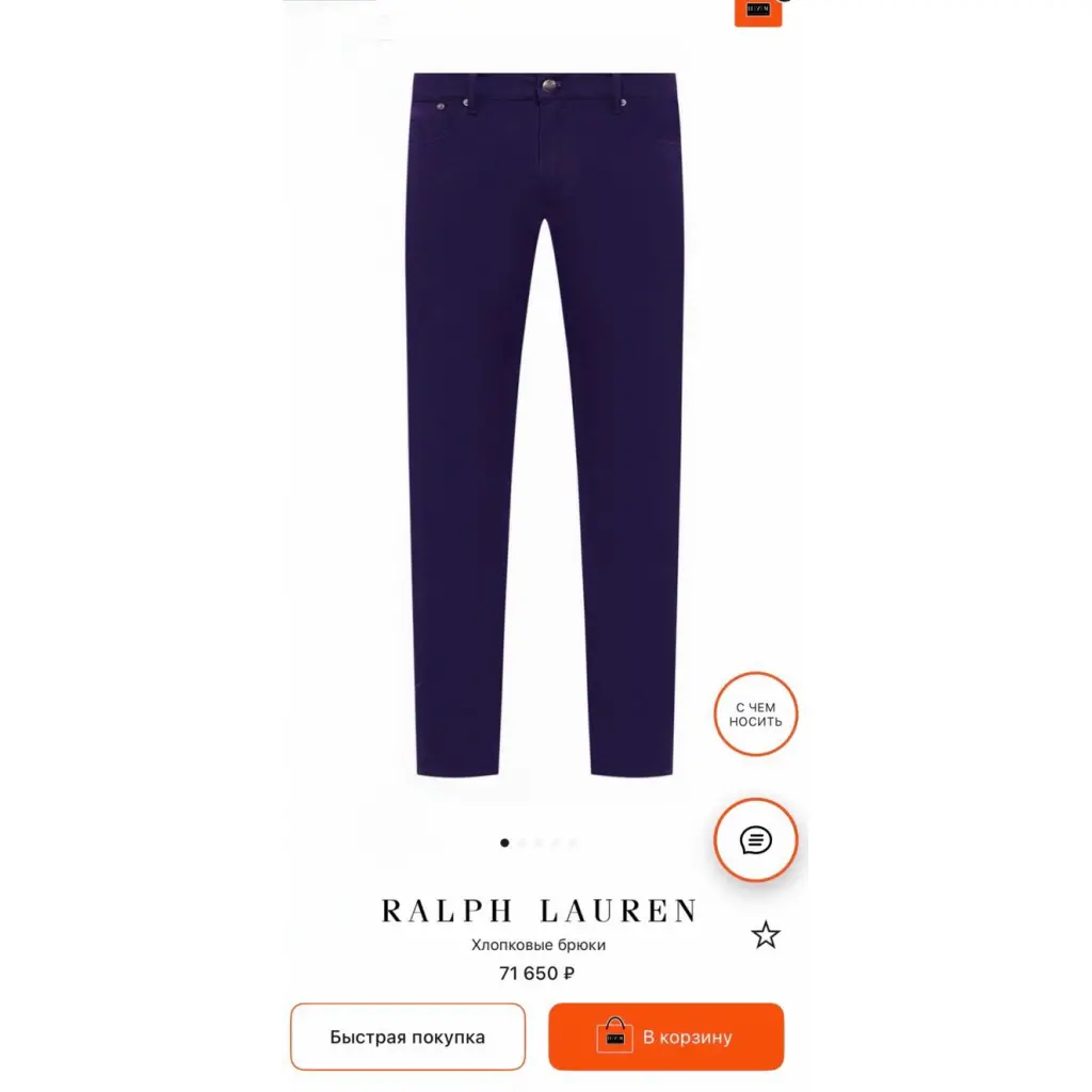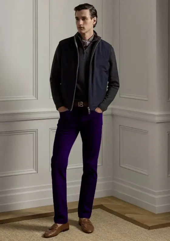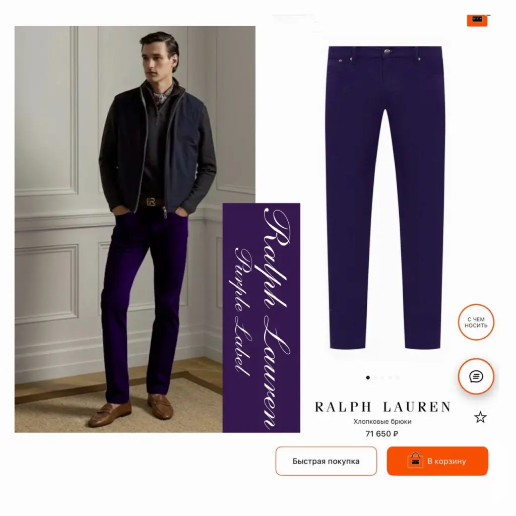 Сиреневые джинсы расширят палитру повседневного гардероба. Ральф Лорен выбрал для пошива модели из весенне-летней коллекции более тонкий и эластичный хлопковый твил, чем тот, который используют обычно. Такая одежда больше подойдет для жаркой погоды. Вещь постирали особым способом, поэтому ее цвет получился неоднородным и очень красивым
