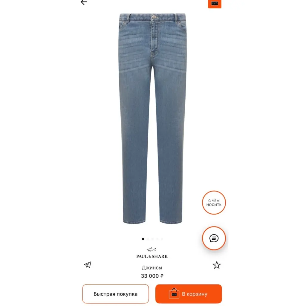 Голубые джинсы сшили из плотного органического хлопка. Его вырастили и обработали, не используя химические вещества, поэтому деним получился мягче обычного. Чтобы брюки лучше тянулись и не сковывали движения, в состав ткани добавили стрейчевые нити. Готовую модель постирали с ферментами, придав ей эффект потертостей