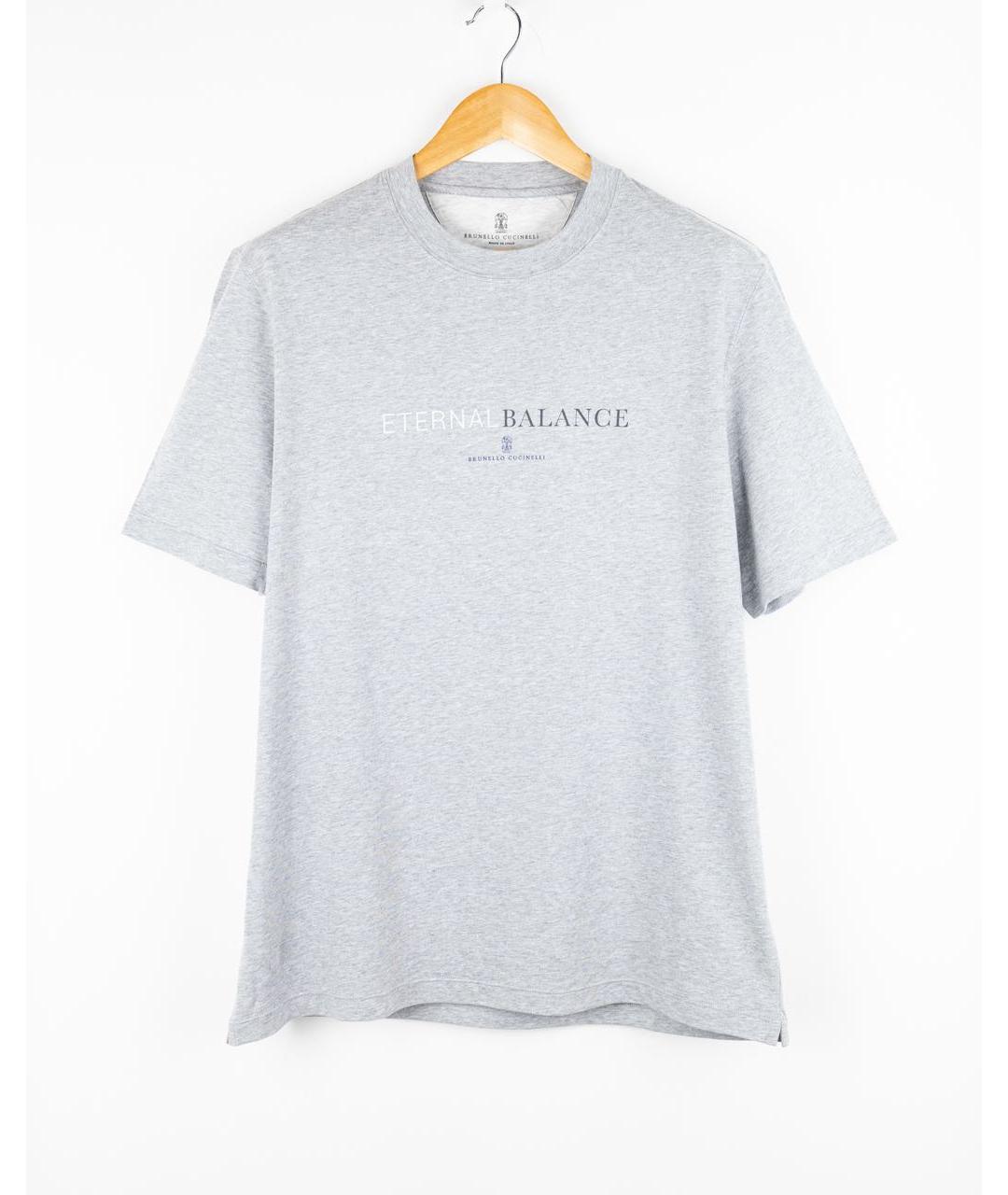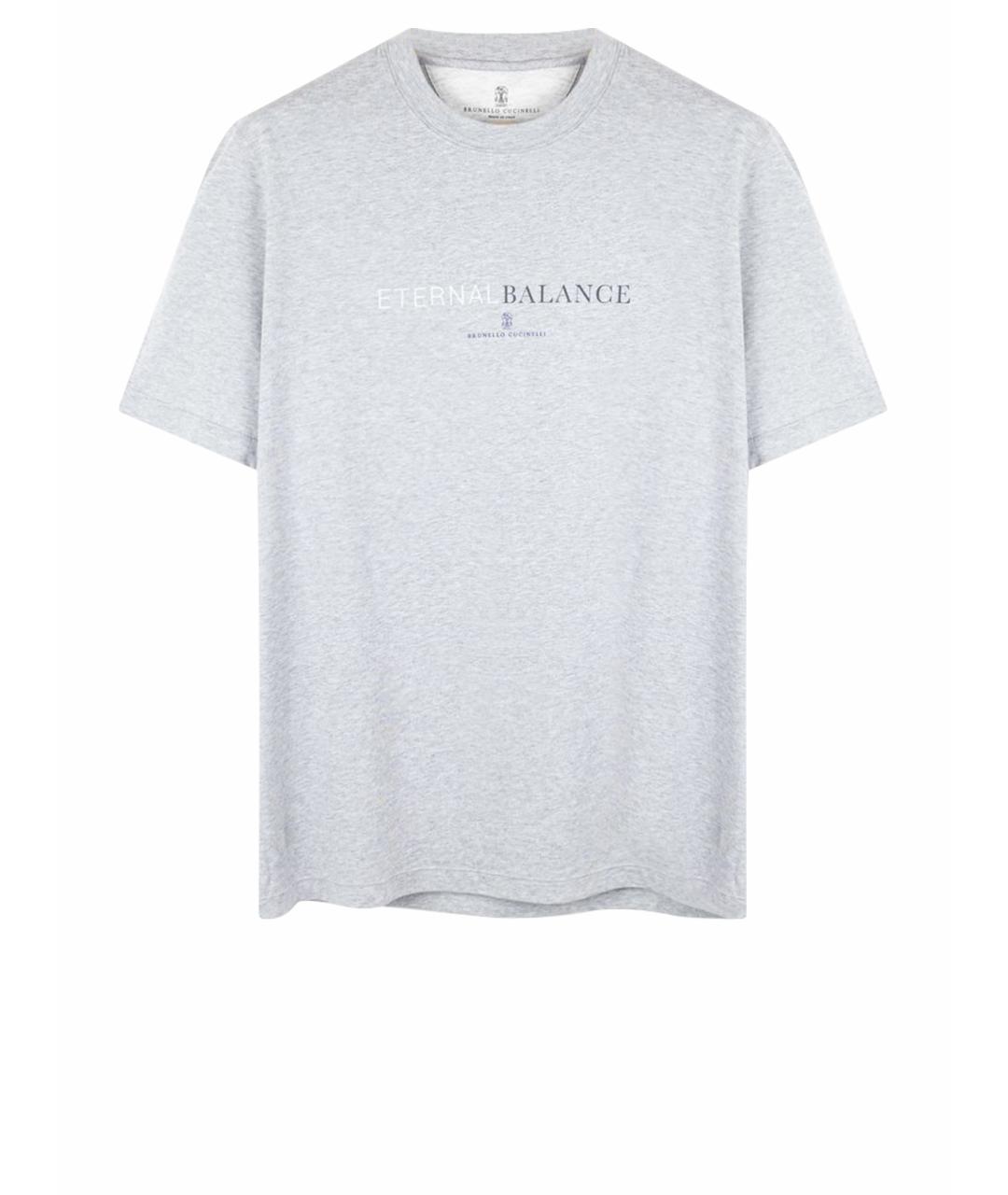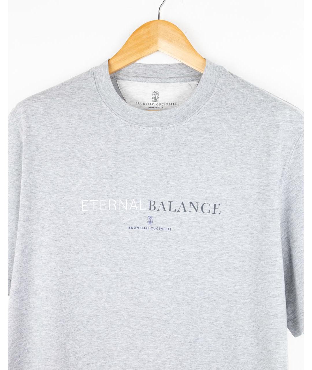 Меланжево-серую приталенную футболку с круглым вырезом выполнили из хлопкового джерси. Модель декорировали двухцветной брендированной надписью Eternal Balance спереди.