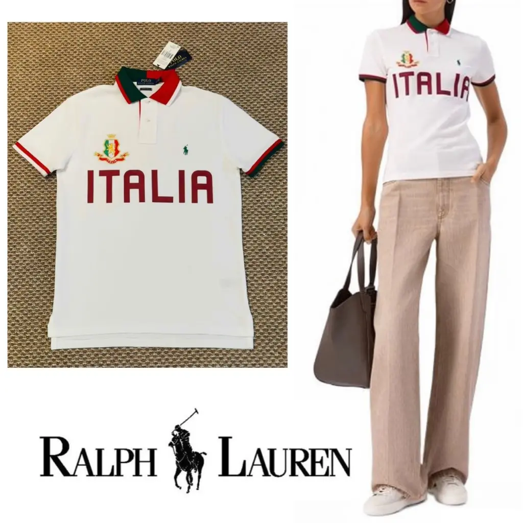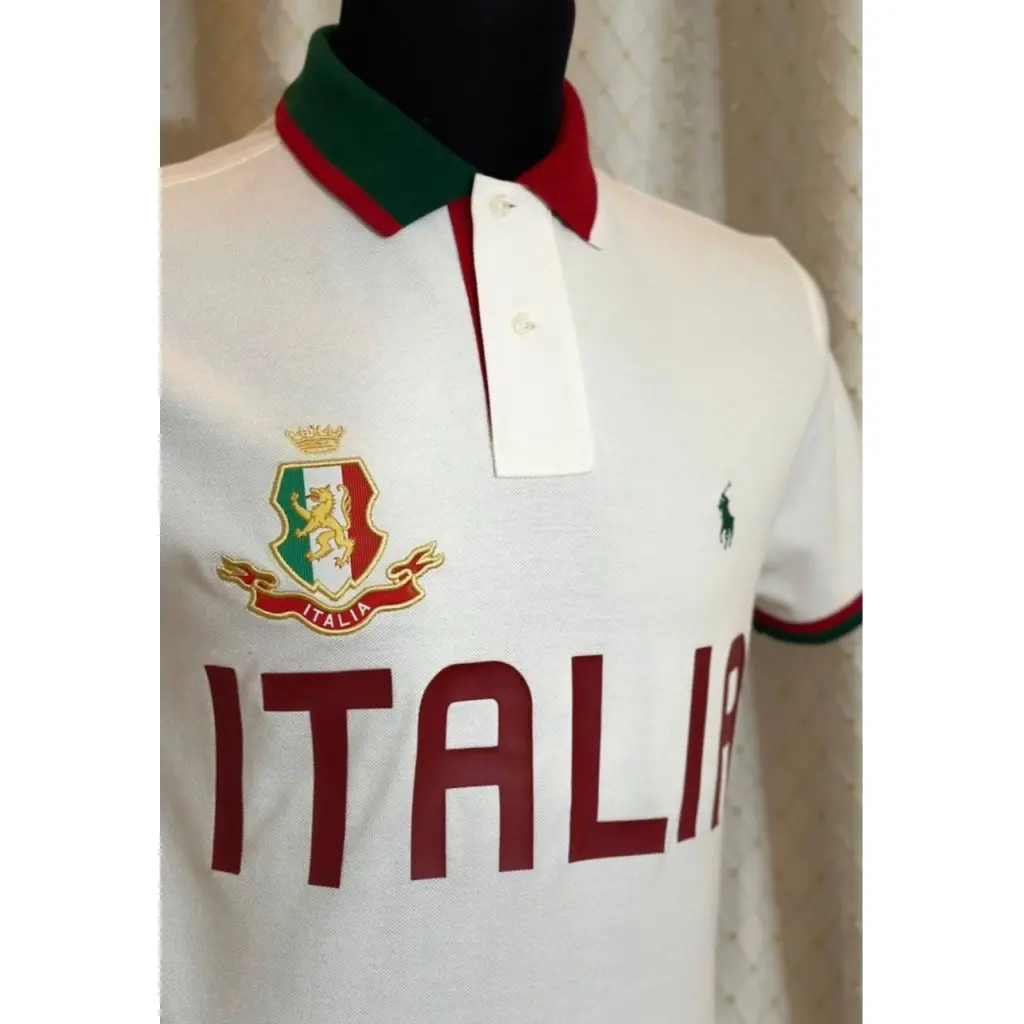 Традиционное поло получило новое звучание. Белая рубашка с короткими рукавами украшена крупным принтом и аппликацией в виде флага Италии. Модель прямого кроя сшита из дышащего мягкого пике на основе перуанского хлопка пима