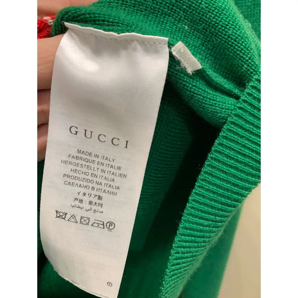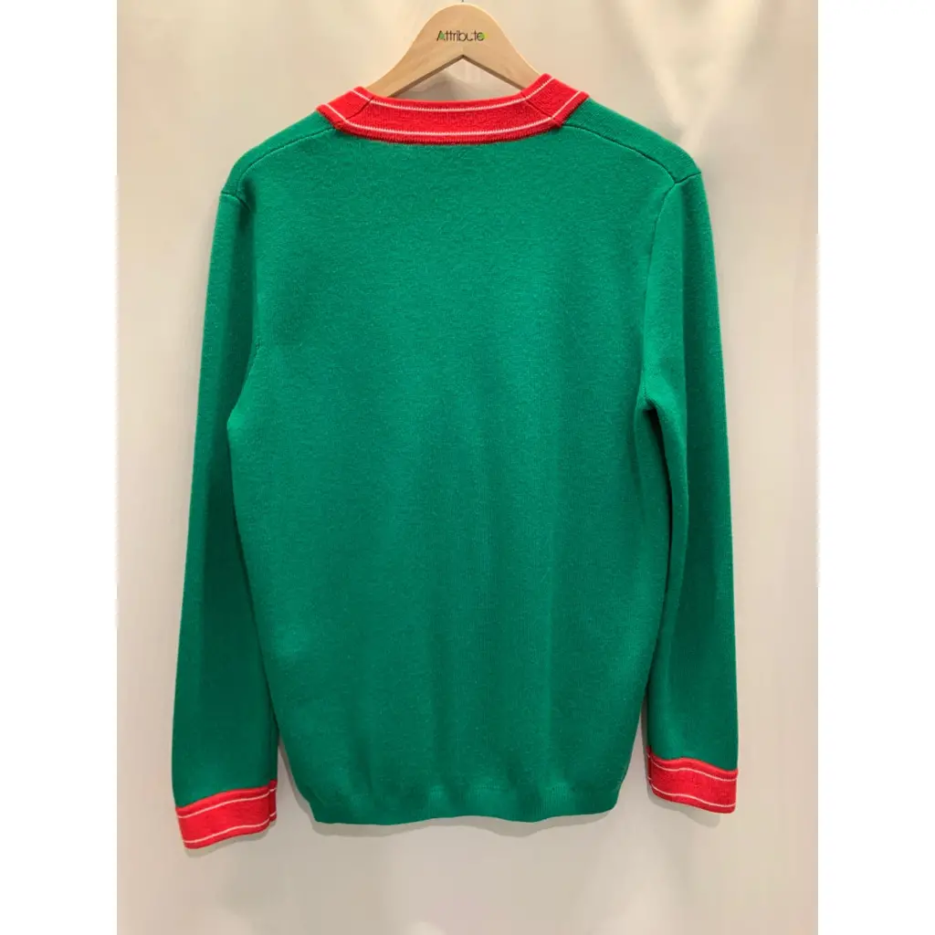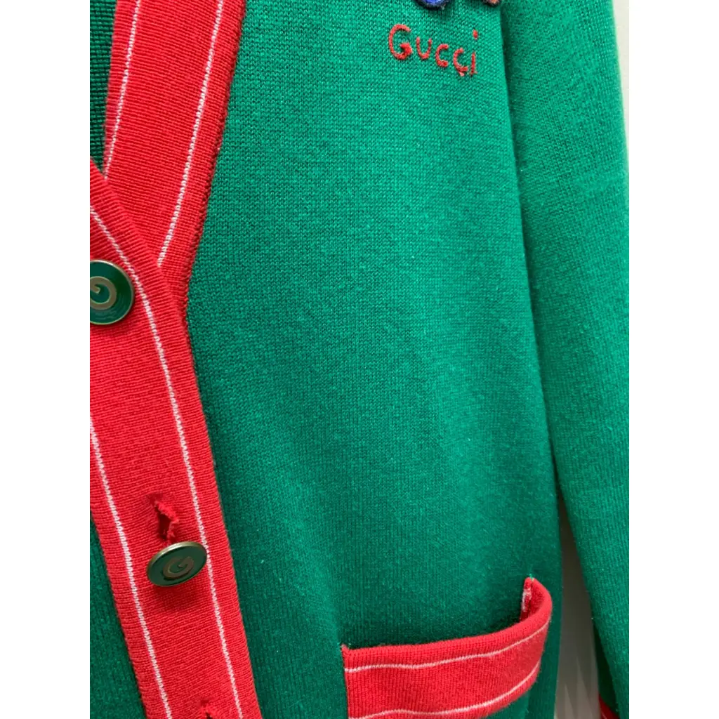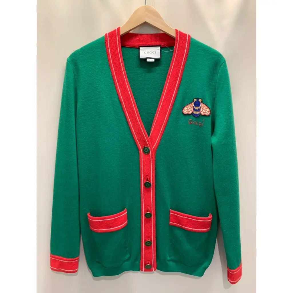 Кардиган Gucci зелёного цвета с красной окантовкой и аппликацией "пчела", хлопок. Состояние очень хорошее, местами есть незначительные катешки которые можно убрать, срезана маркировка размера.