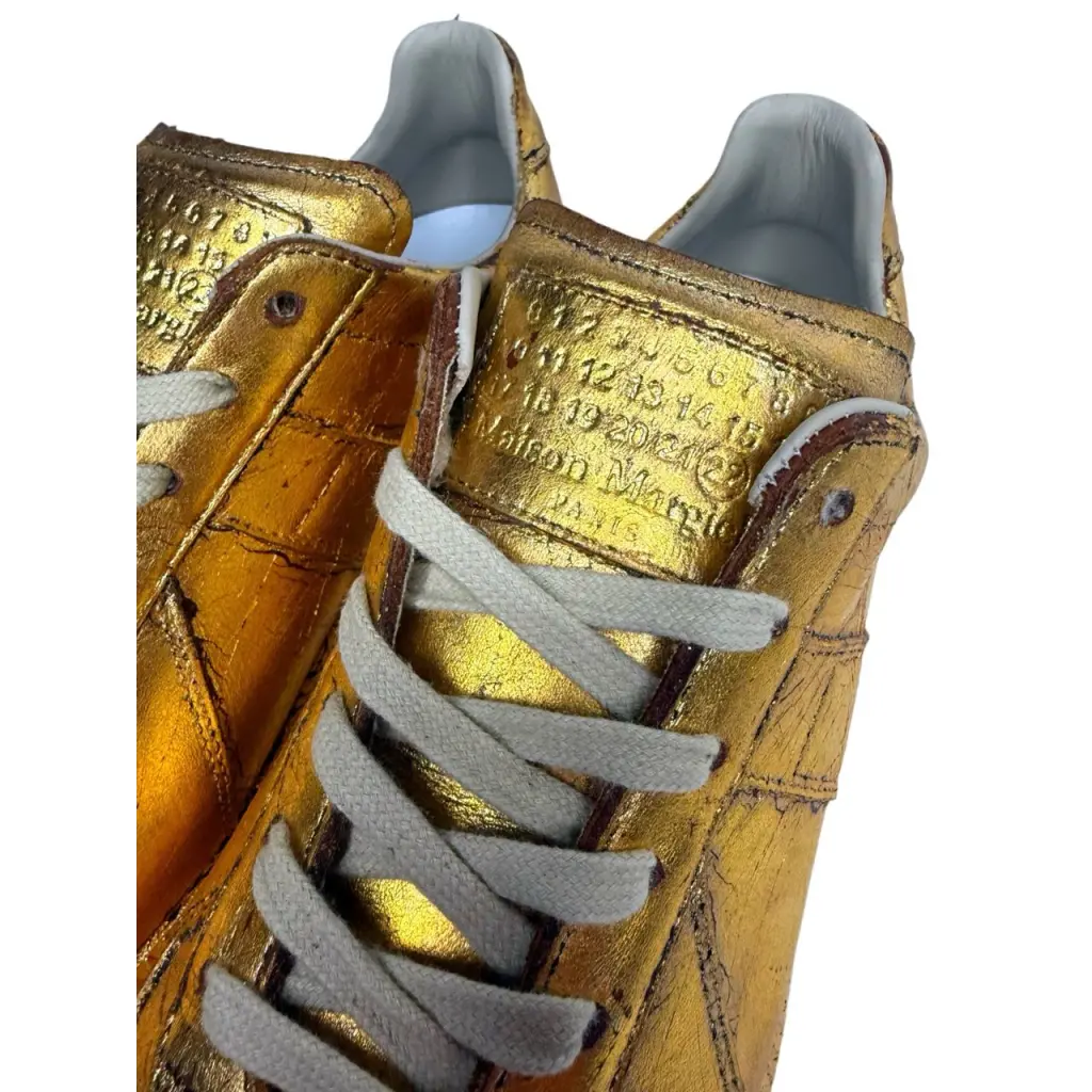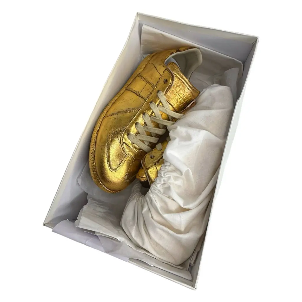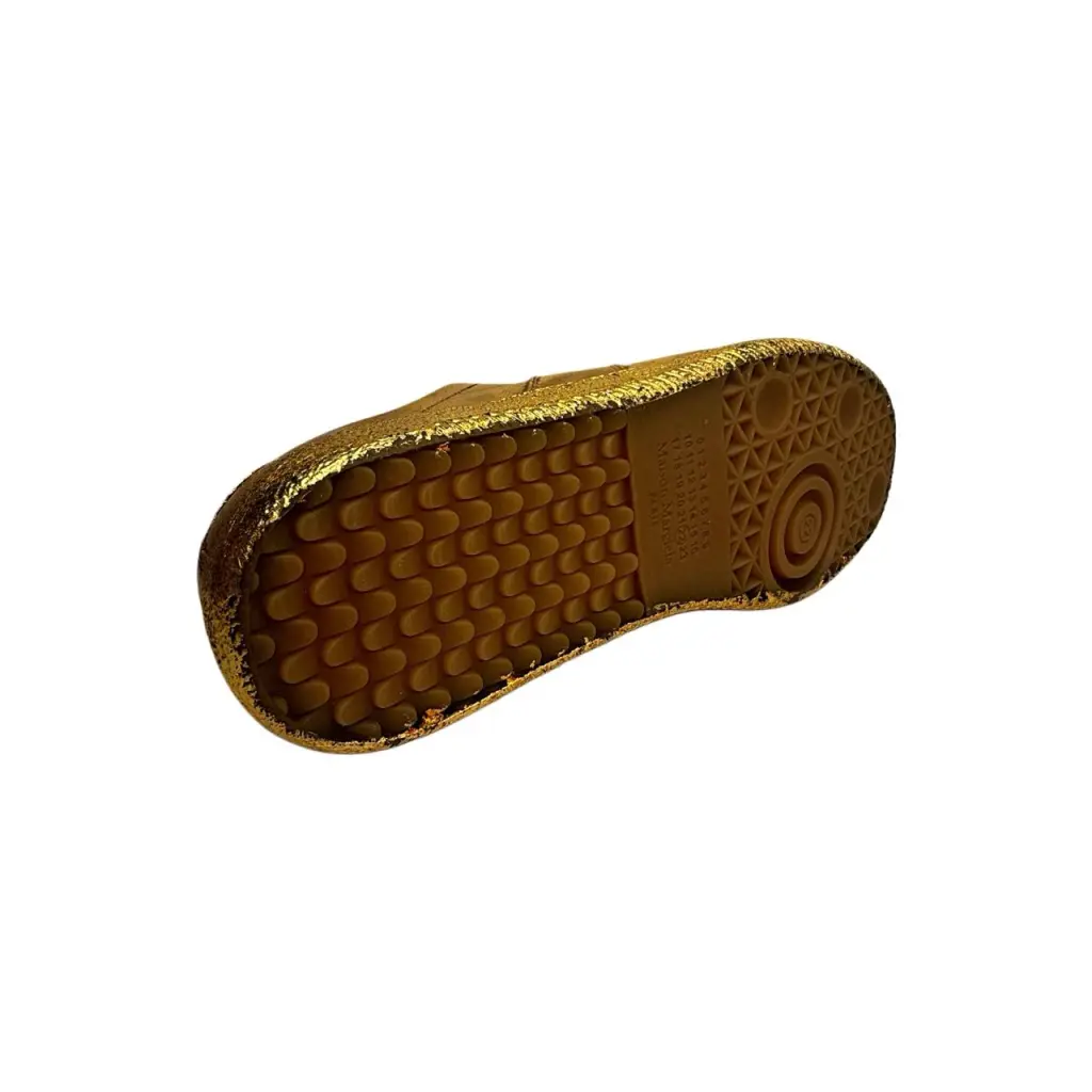 Шикарные кеды, выполненные из мягкой телячьей кожи, поверх которой нанесён тонкий позолоченный слой с выразительной фактурой и насыщенным металлическим блеском. Со временем верхний слой естественно истирается, проявляя благородную винную основу и создавая уникальный "distressed" эффект.