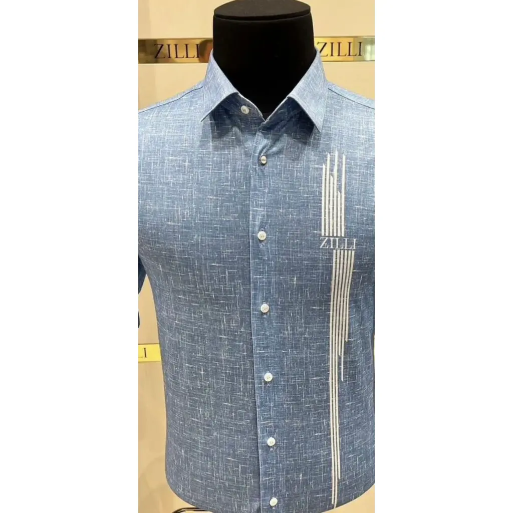 Стильная рубашка Zilli из мягкого хлопкового трикотажа. Оригинальная модель прямого кроя, изысканного голубого оттенка украшена белыми узором в вертикальную полоску и лаконичной фирменной надписью бренда слева на груди, а также декорирована белым абстрактным узором, создающим эффект меланжа, по всей поверхности