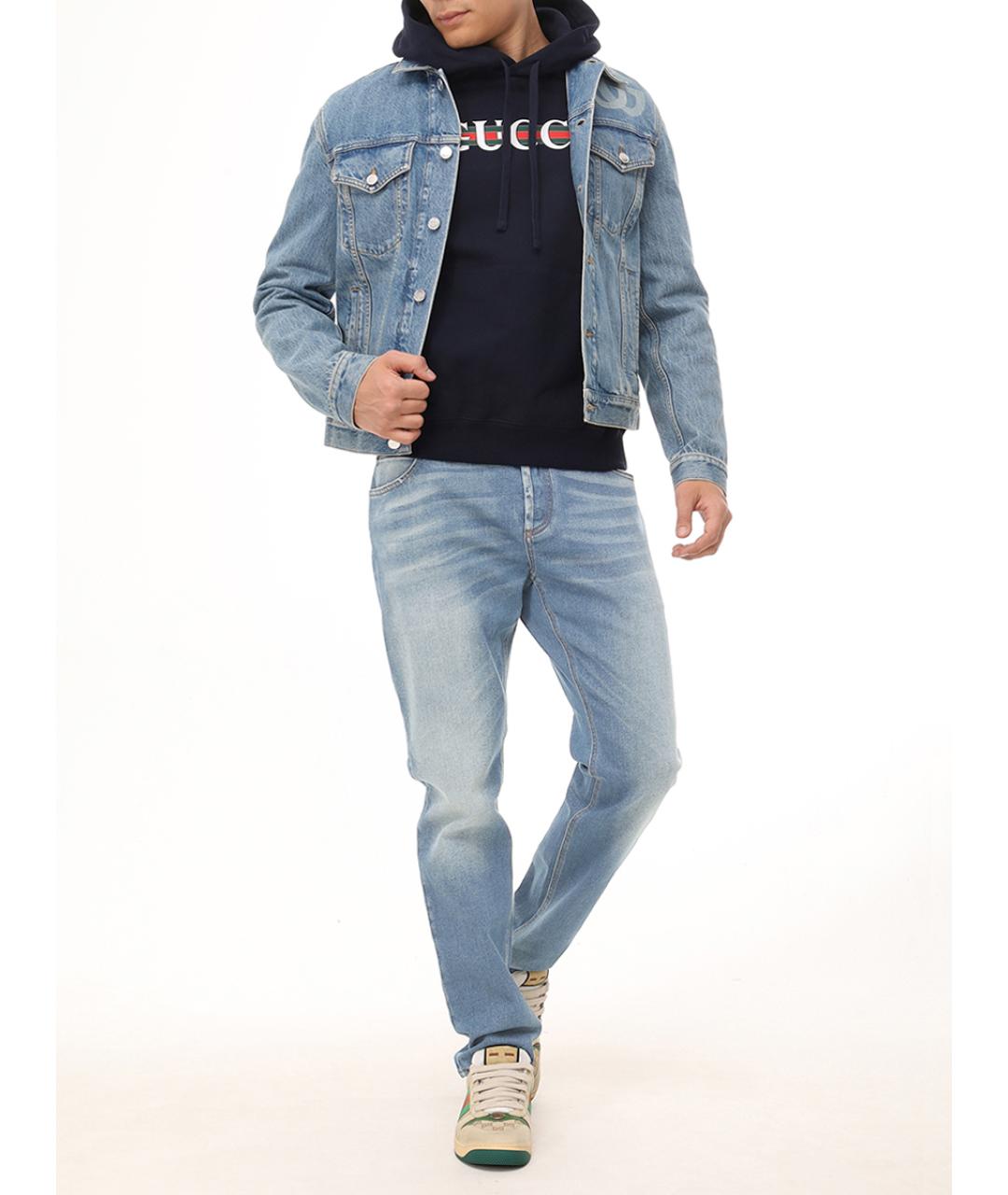 -Темно-синее худи из хлопка от GUCCI. -Модель свободного силуэта с длинными рукавами, эластичными манжетами и поясом, накладным карманом-кенгуру спереди, капюшоном на кулиске, логотипом бренда на груди.