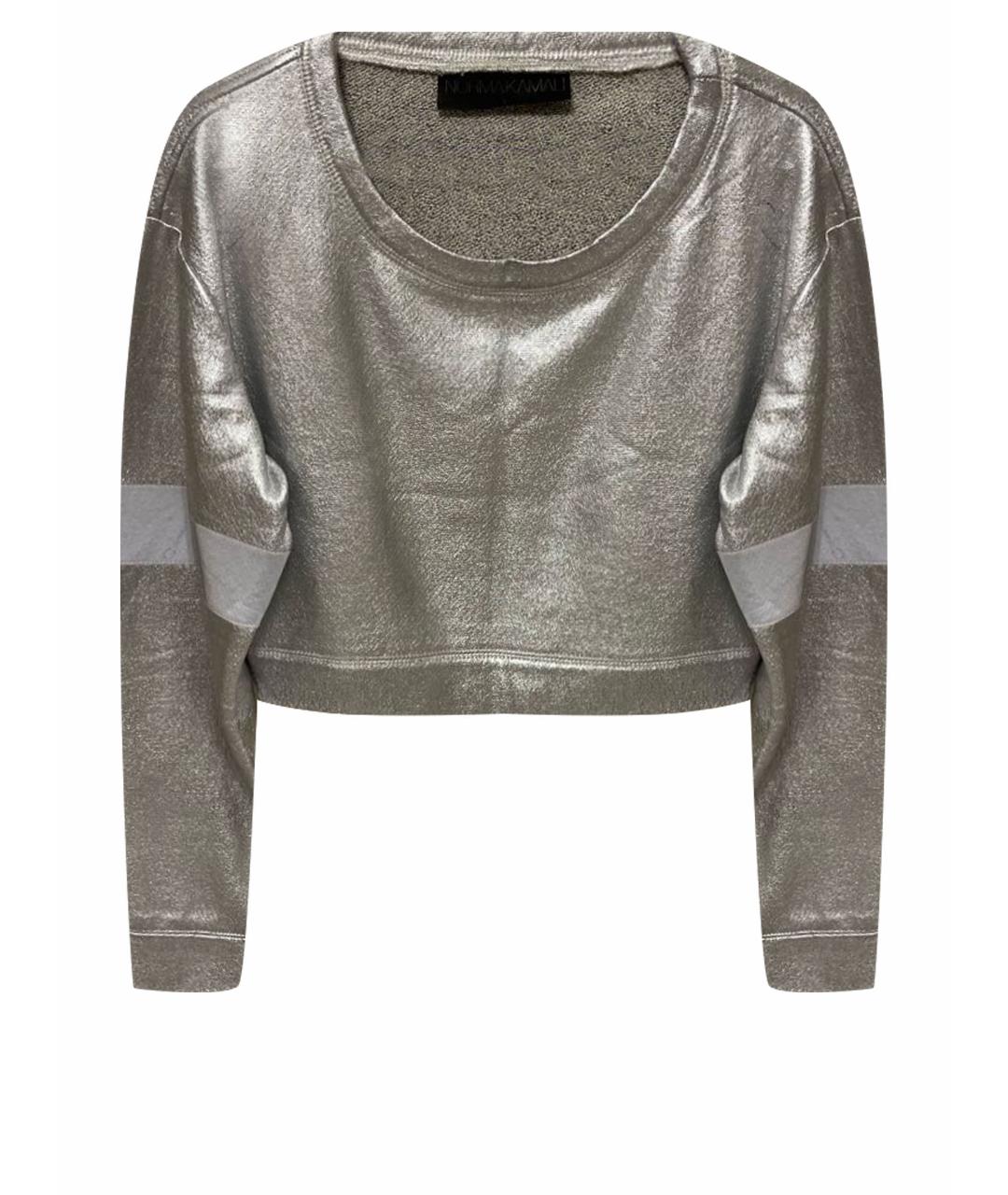 Кроп свитшот, 60% хлопок, покрыт серебряной краской, со светоотражающими элементами на рукавах. Есть царапина в районе ключицы. Рукав опущен. Без упаковки. Маленький, на русский 40-42 размер. Покупала на net-a-porter.