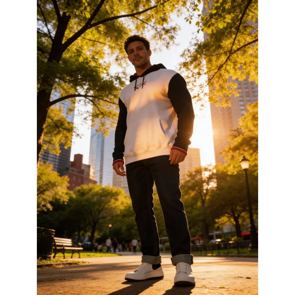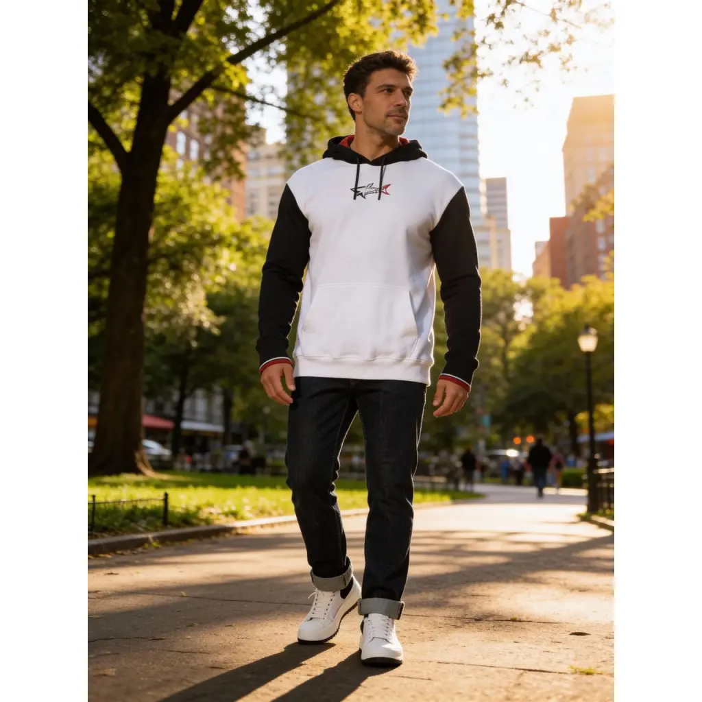 Для пошива этого худи мастера марки использовали мягкий органический хлопок кипенно-белого и чернильно-синего оттенков. Алый сетчатый подклад капюшона превращает контрастную гамму в знаковый для бренда триколор. Цвета повторяются на эластичных манжетах и фирменном изображении акулы, вышитой спереди.