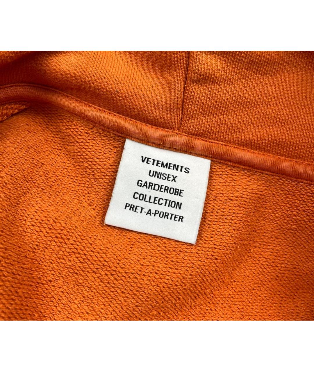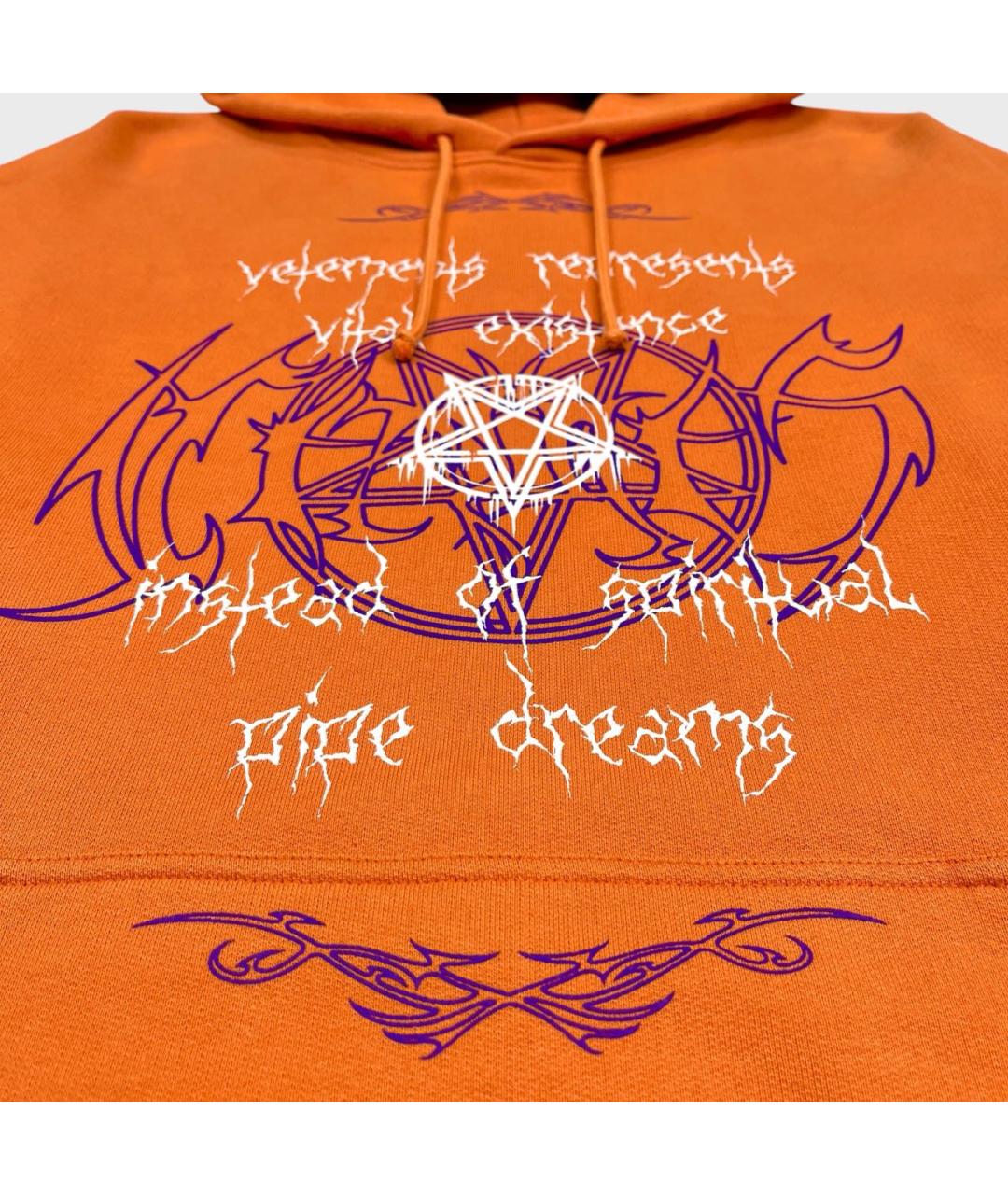 Оранжевое худи Vetements из весенне-летней коллекции выполнено в характерной для бренда эстетике. Тон задают как свободный крой со спущенной линией плеч и утрированно длинными рукавами, так и двухцветный бунтарский принт Vital Existence с пентаграммой и надписями в готическом стиле. Для пошива модели мастера марки использовали мягкий хлопковый трикотаж с добавлением прочного полиэстера. Данная коллекция выпущена ограниченным тиражом.