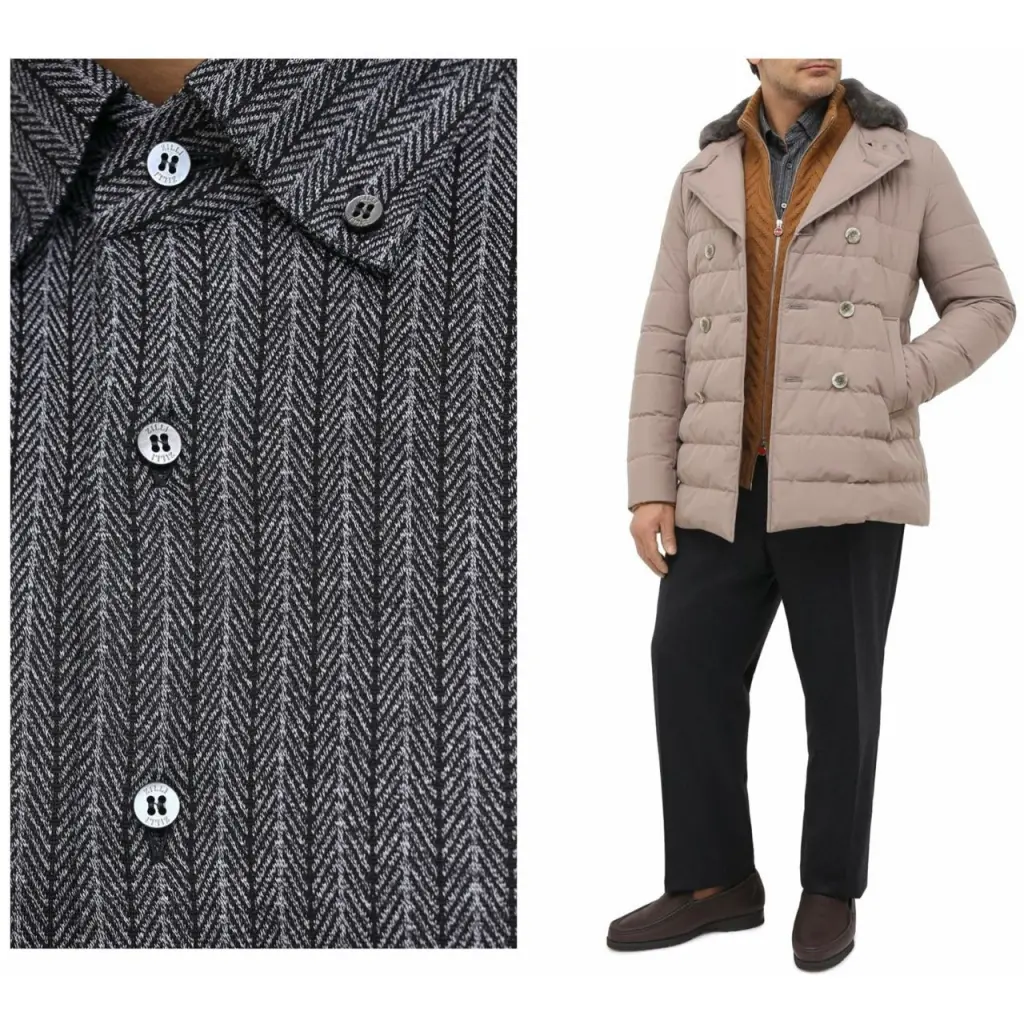 Шевронный мотив и контрастный подол серой рубашки из осенне-зимней коллекции помогут снизить градус формальности образа с брюками и пиджаком. Модель с воротником button down выполнили из мягкого текстиля на основе шелка и хлопка. Комбинация таких волокон позволяет изделию хорошо пропускать воздух и долго сохранять форму!нет бирки с составом