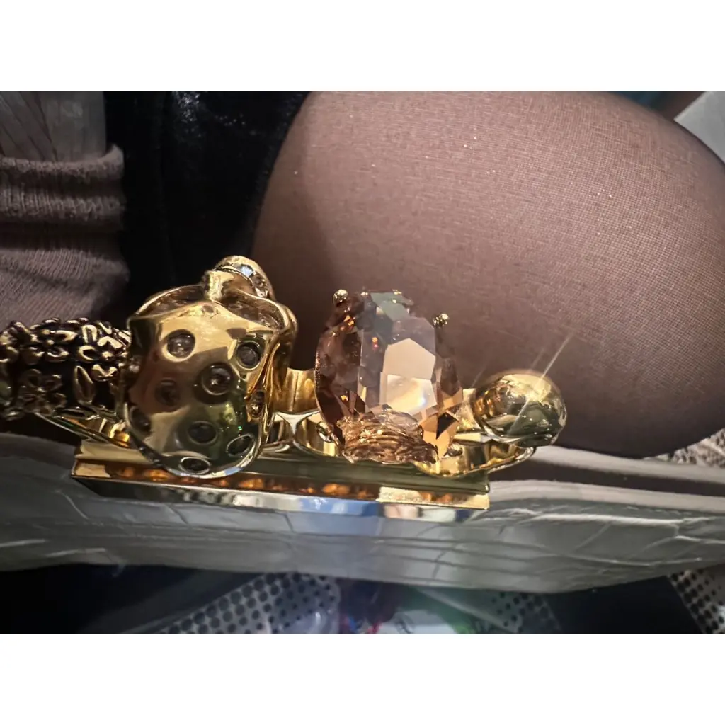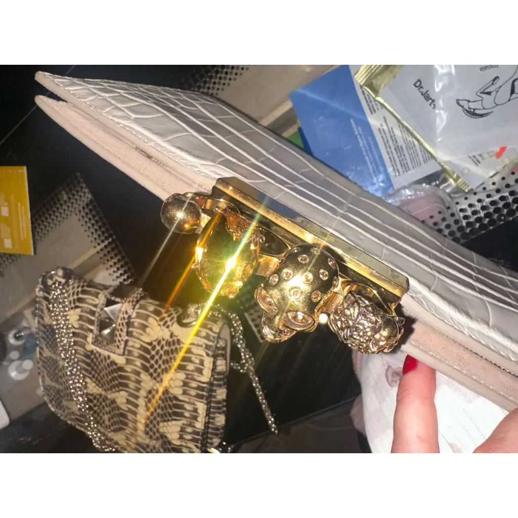Клатч в идеальном состоянии. Один нюанс - камень большой на месте, но немного дал трещину. Это никак не влияет на носку и даже почти не видно. С ним это произошло почти сразу, и так он прожил крайне долго, на носку не влияет. В цене учтено.