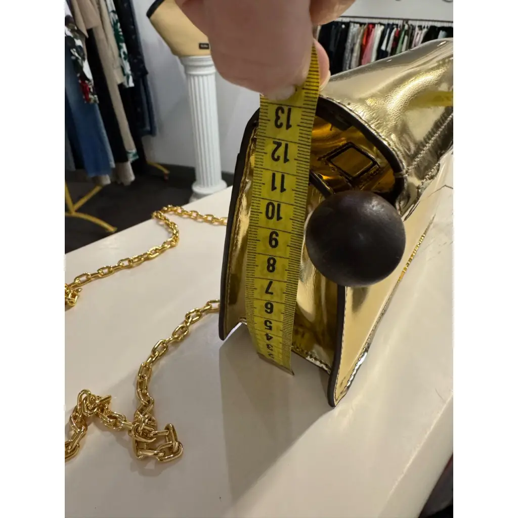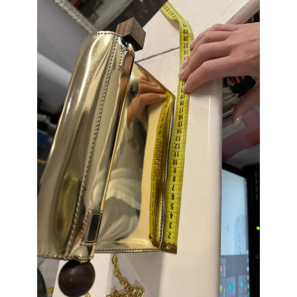 Сложенная сумка-клатч золотого цвета с зеркальным эффектом. Рулоны открываются для доступа внутрь, деревянные наконечники сферы и куба, длинный позолоченный ремешок-цепочка через плечо, магнитная застежка, внутренний карман для карточек, позолоченный логотип и фурнитура.