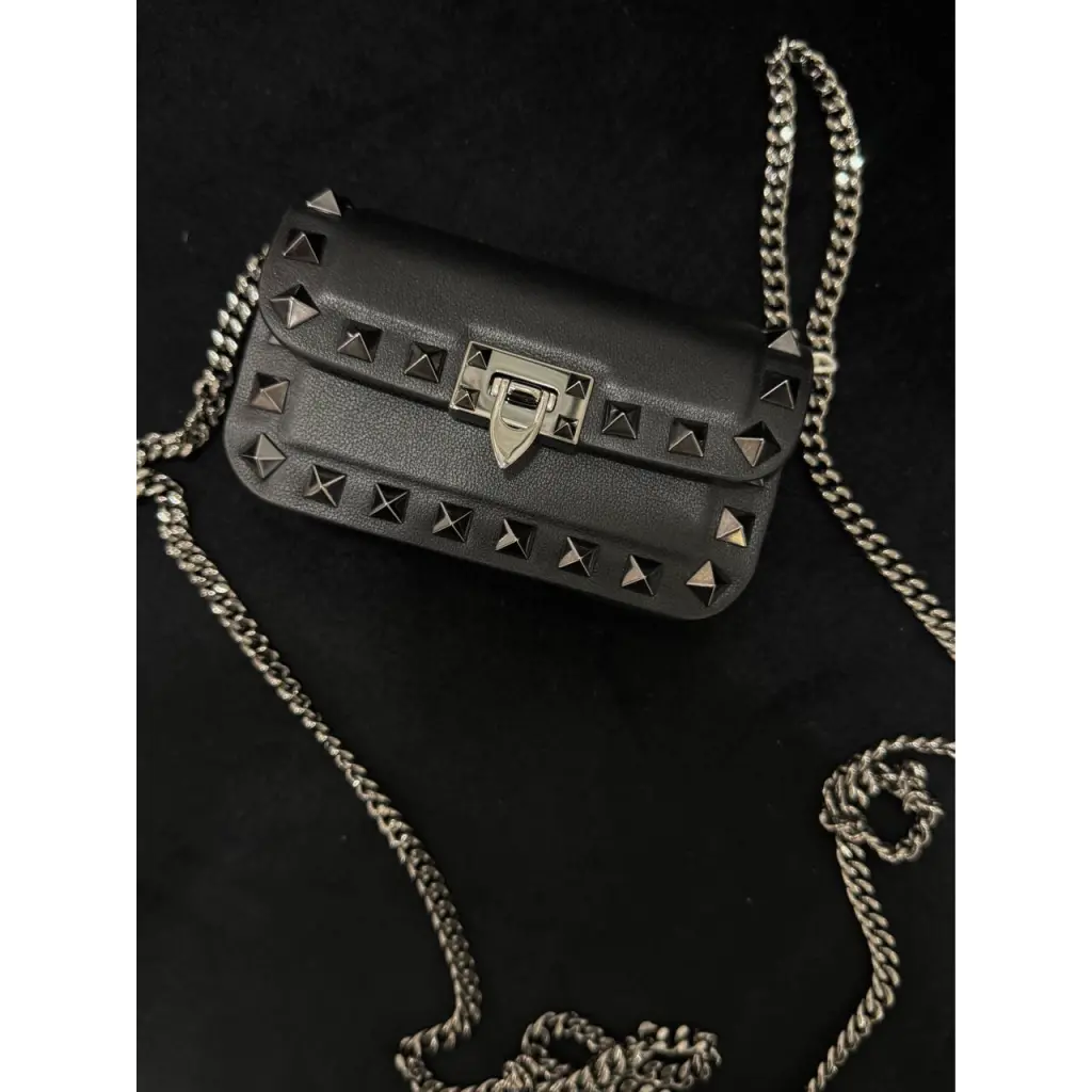 Клатч Studs на цепочке Valentino Black Leather Rockstud Chain Pouch Width 3 cm Height 7 cm Hardware Gunmetal Tone Exterior Material Leather Interior Material Leather Origin Italy Shoulder Strap 55 cm