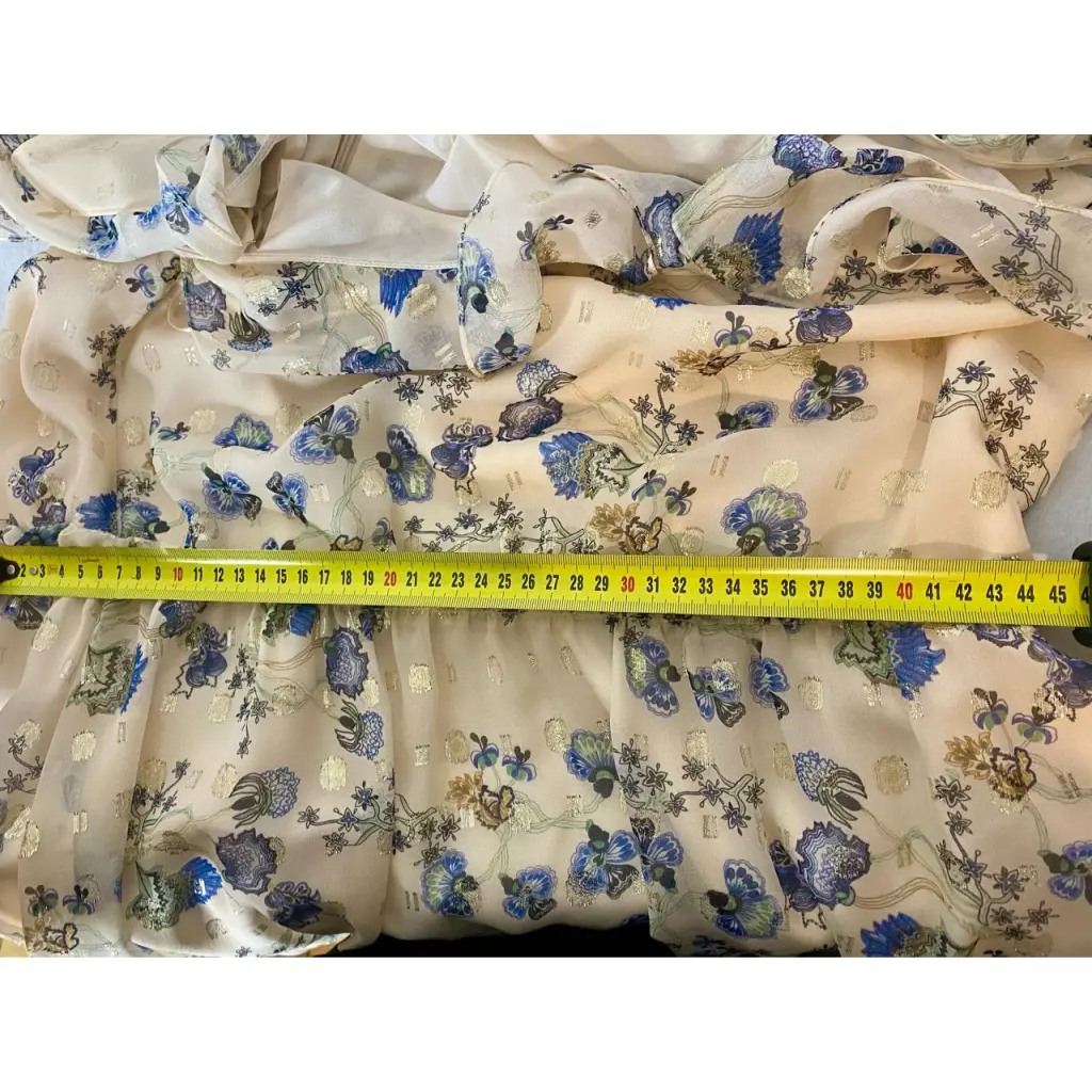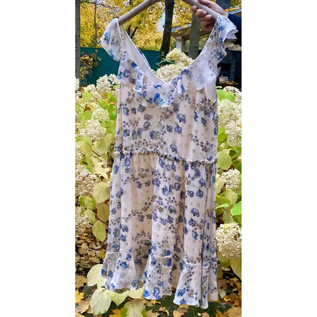 Новое шелковое платье CHLOE в цветочек, нежного абрикосового оттенка- фото не передает базовый цвет. Модель до колена, с глубоким вырезом на груди и спинке, по вырезу и низу- волан. Цветочный паттерн на ткани украшен вышитым золотой нитью, деликатным горошком. Французский 44, но за счет модели и резинки на талии, вполне подойдет на российские 46,48,50.