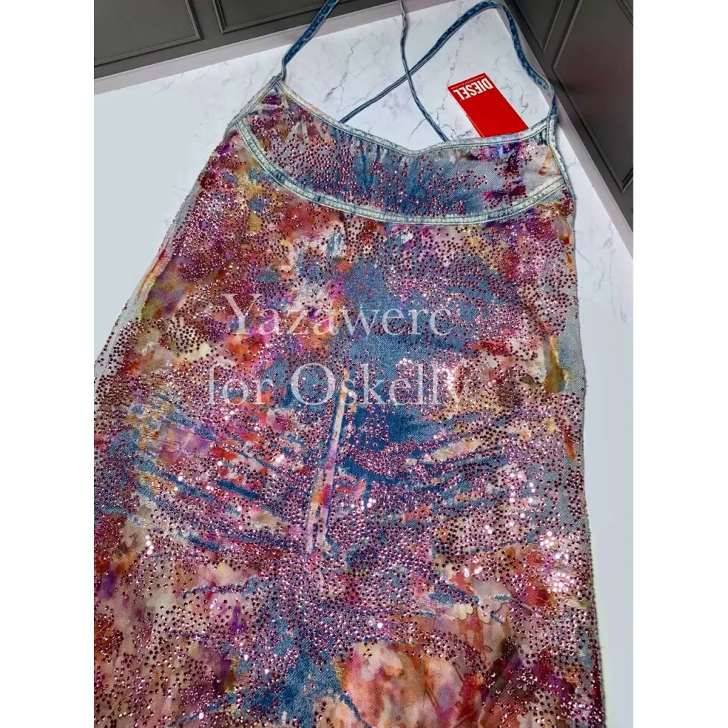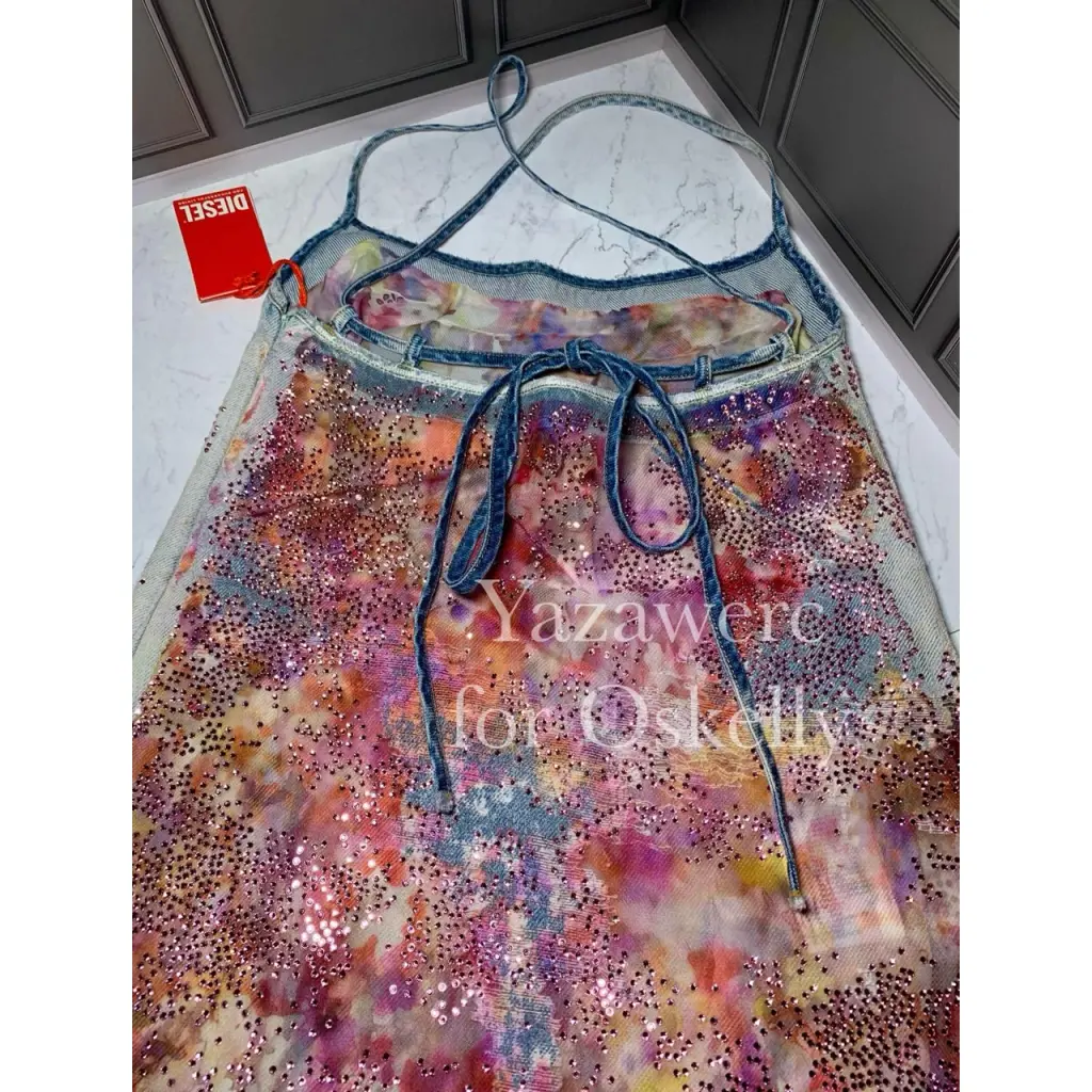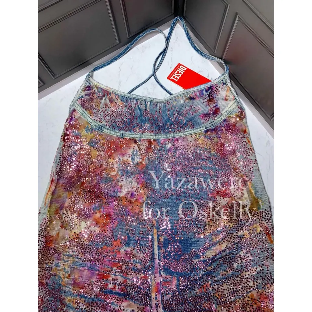 Женское платье-миди с открытой спинкой и узкими бретельками с перекрестными бретельками. Ехtrа shоrt silhоuеttе изготовлен из средне-голубого денима, сочетающего в себе фирменное мастерство Diеsеl с ливнем микрокристаллов. Ткань обработана коррозией по всей поверхности, которая придает одежде прозрачную отделку, раскрывая внутренние конструкции ткани и подчеркивая, где одежда естественным образом складывается с износом. Эти искусные усы украшены стразами для женственного взгляда на ультра-потрессированный вид.
