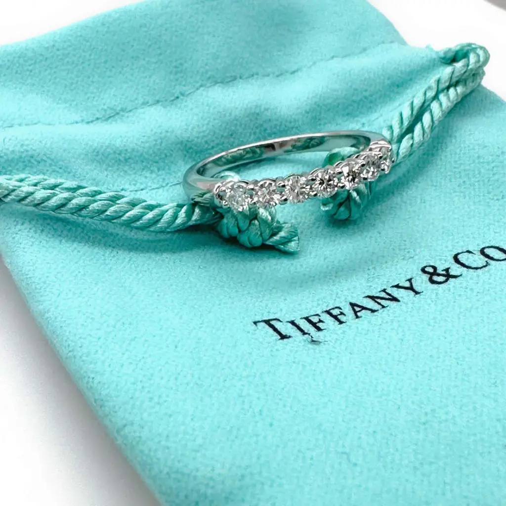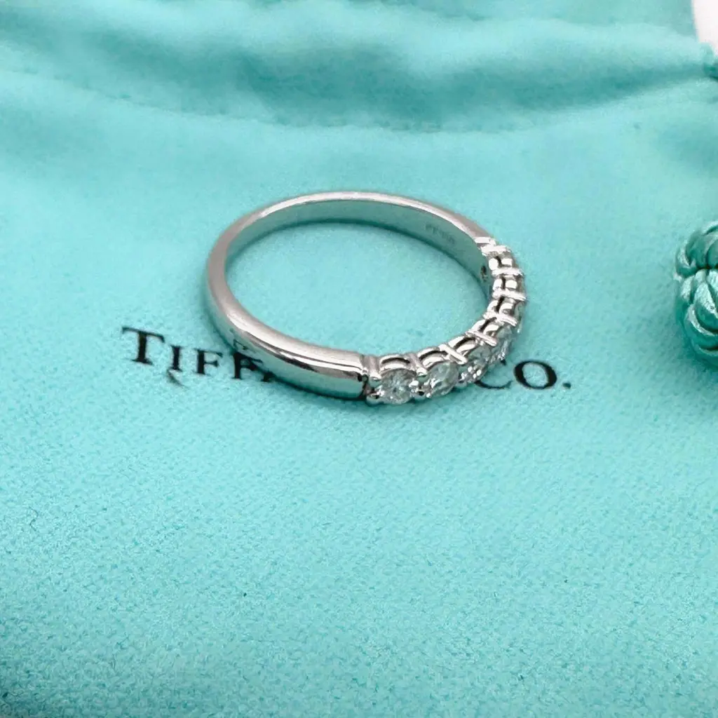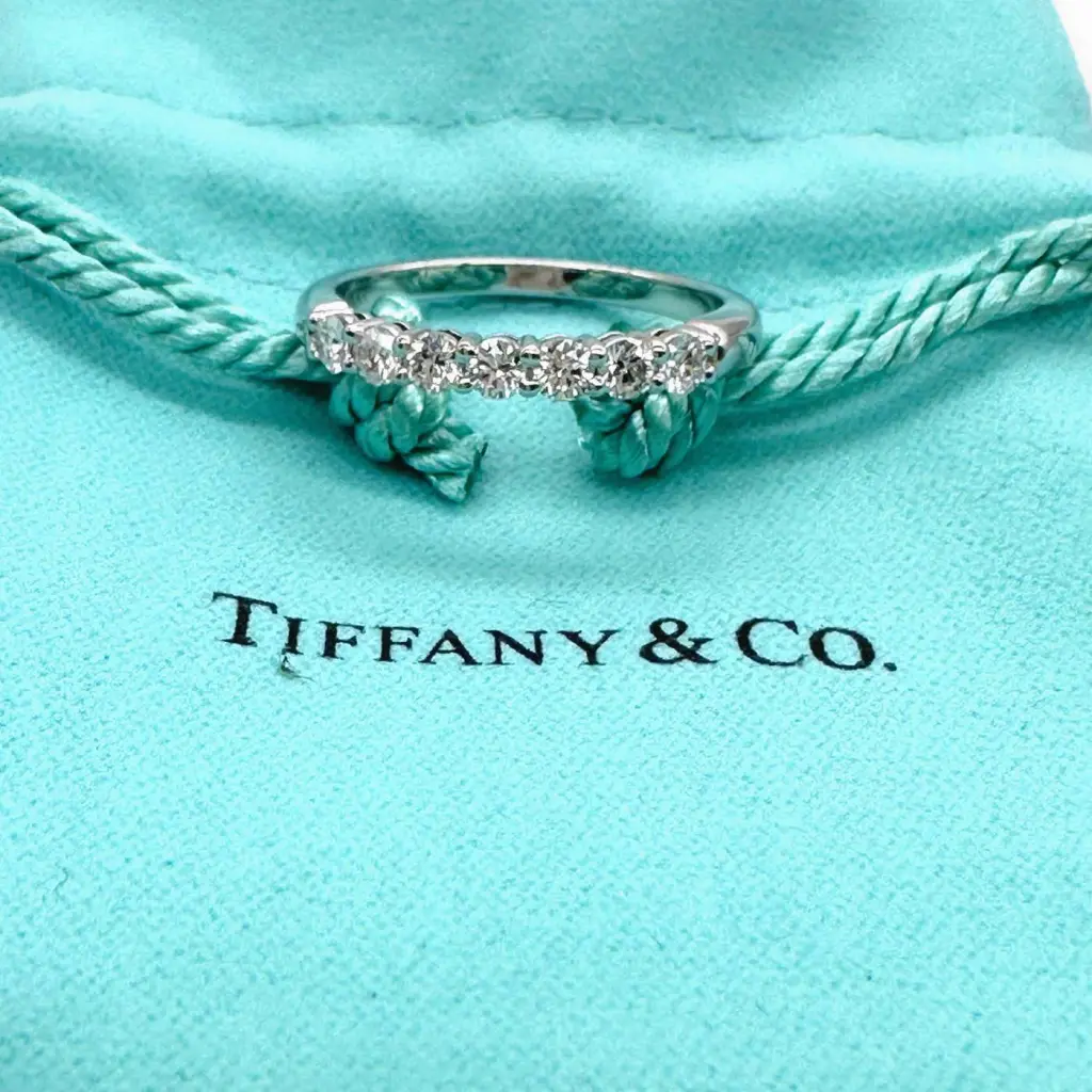 Кольцо Tiffany & Co коллекции "Forever" выполненное из платины 950 пробы с 7 бриллиантами классической формы огранки общей массой 0,57 ct. Ширина 3 мм. Размер - 15,0 (48). Вес - 4,22 гр.