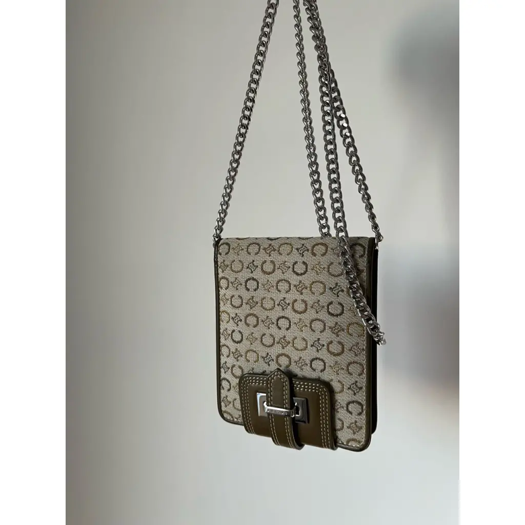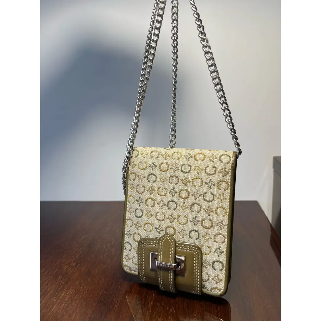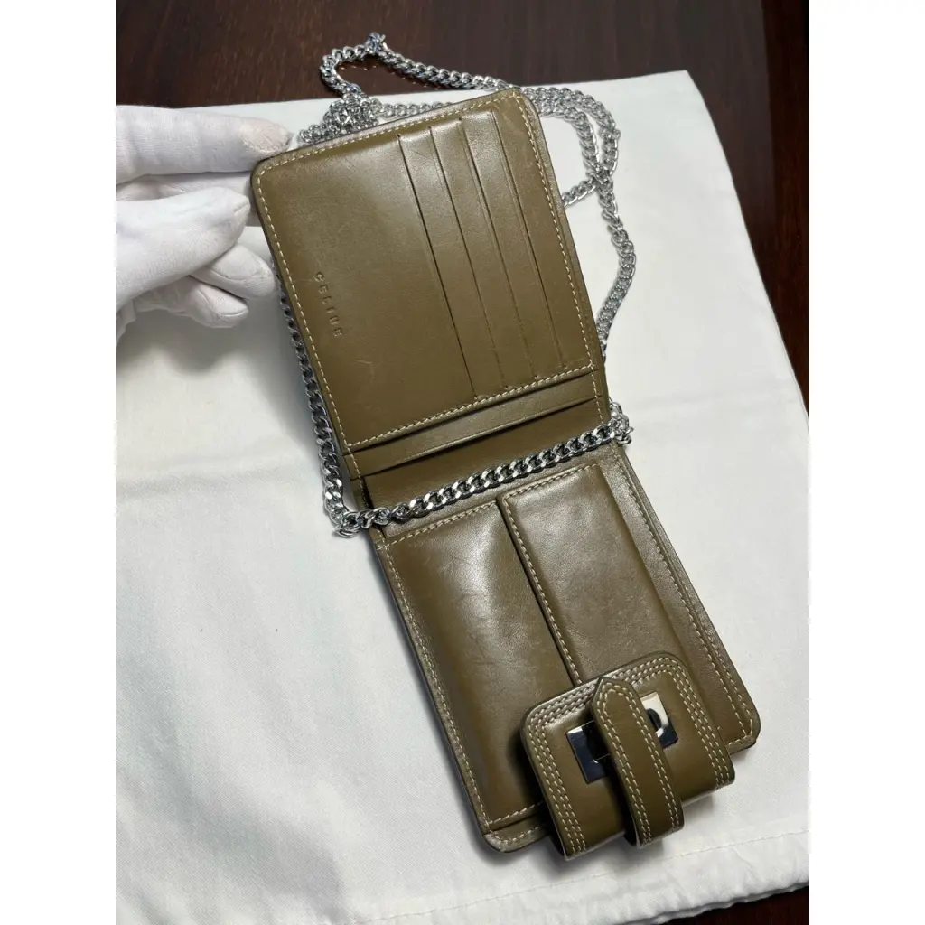 Кошелек выполнен из фирменного холста с узнаваемым паттерном «C Macadam» в зеленых оттенках. Имеет отделение с откидной крышкой, за которую можно зацепить цепочку. Цепочка другого бренда идет в комплекте как дополнение.