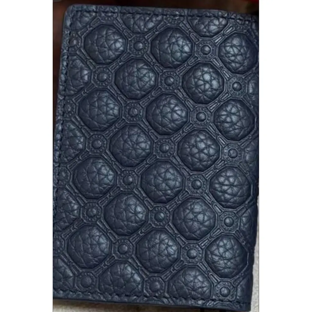 декоративной фурнитурой. Поверхность складной модели тёмно-синего цвета покрыта фактурным геометрическим узором. В удобный и компактный аксессуар поместятся визитные карточки и банковские карты, которыми вы постоянно пользуетесь. В роли атрибутов Дома выступают деталь-восьмигранника серебристого оттенка со вписанной в неё головой орла и тиснёный логотип во внутренней части изделия.