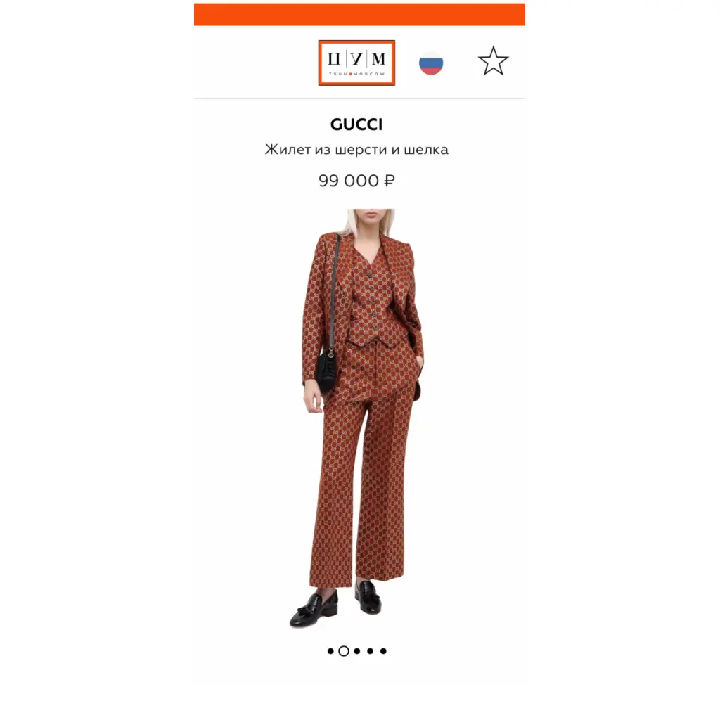Костюм Gucci из осенне-зимней коллекции Алессандро Микеле, модель классического кроя из мягкой шерсти и шелка. Паттерн СС Supreme на ткани выполнен металлизированными нитями. Приобретался в tsum, надевался лишь пару паз на публичные выступления, поэтому в идеальном состоянии.
