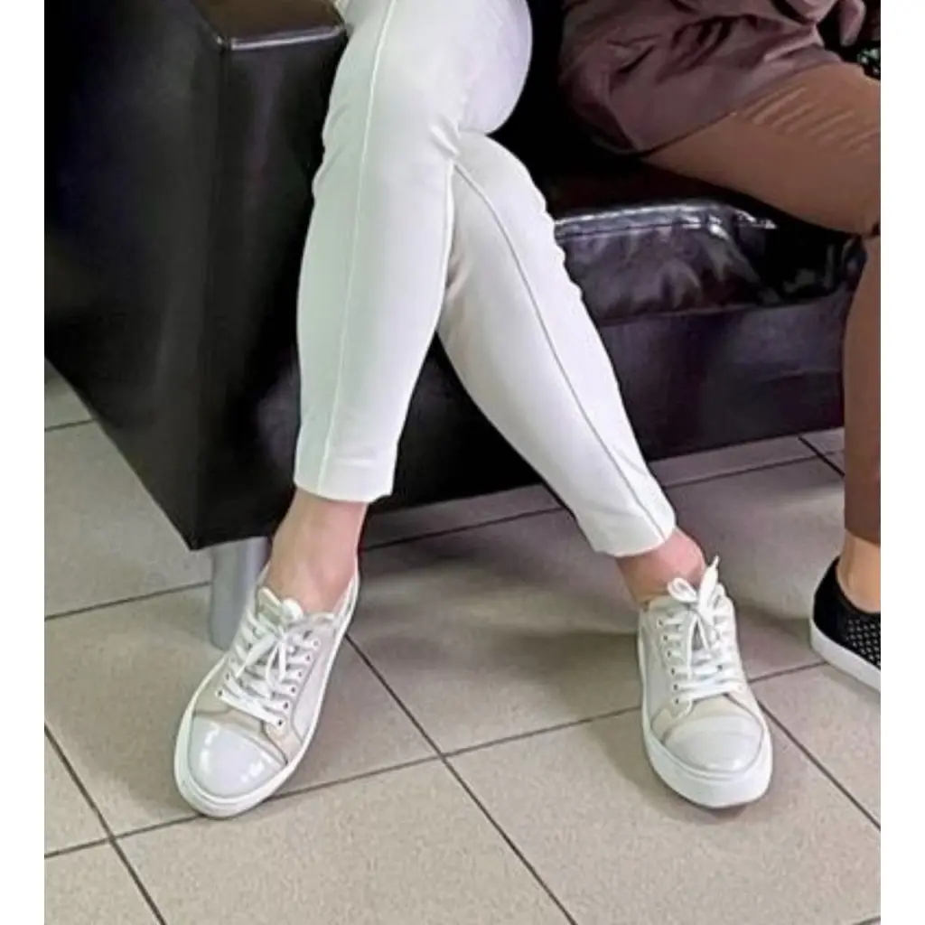 Стильные бежевые кеды Christian Louboutin со знаковой для бренда красной подошвой изготовлены из натуральной кожи двух светлых цветов, одна из которых перфорирована под кожу крокодила. Элегантно, стильно, дорого.