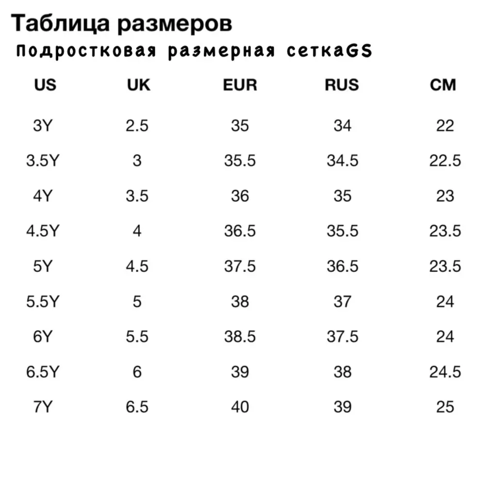 Вы можете самостоятельно определить свой размер, воспользовавшись таблицей размеров в лоте товара. Вся обувь представлена в EUR размерах. Для удобства в таблице размеров лота показано соответствие US размеров с UK, EUR, RU размерами и длиной стопы.