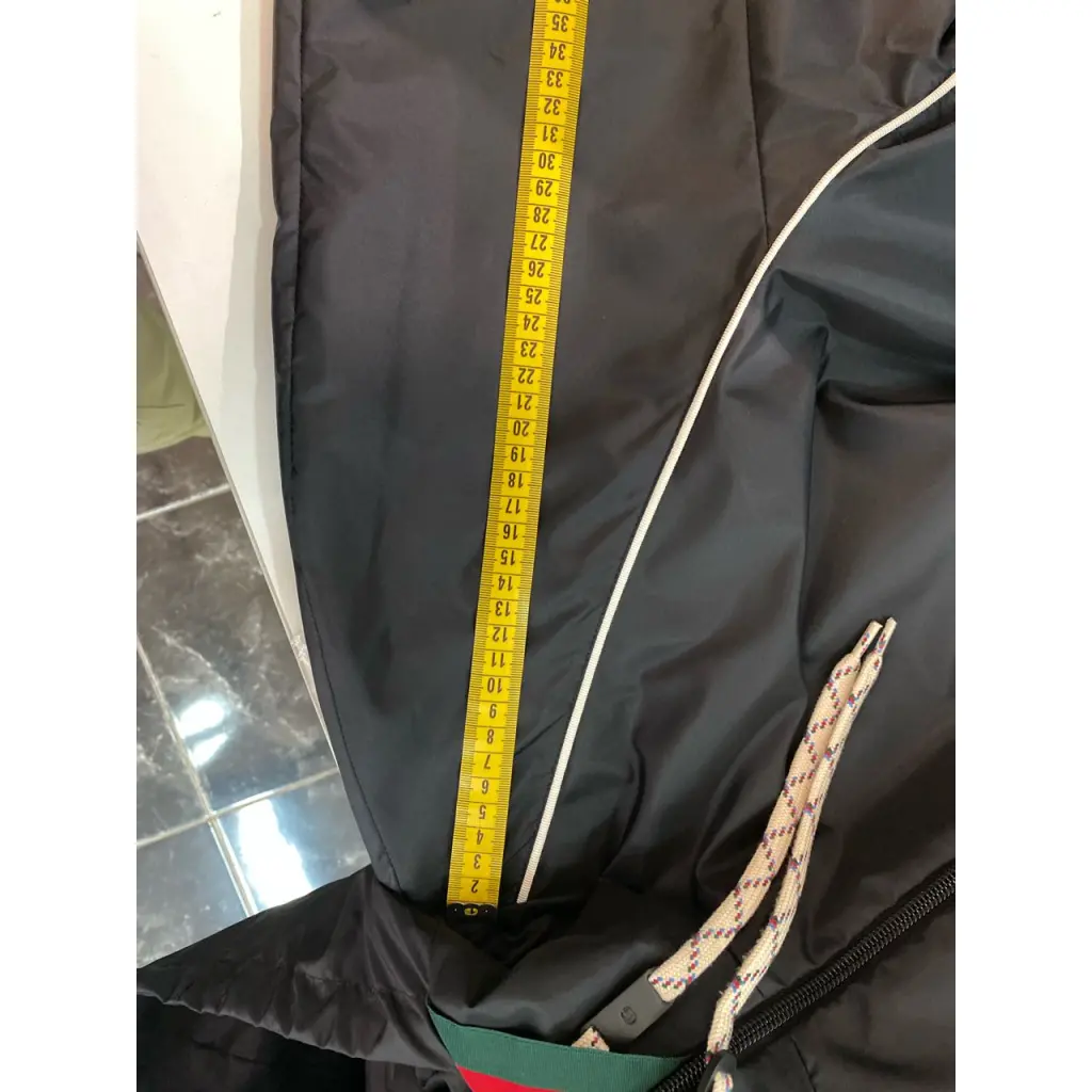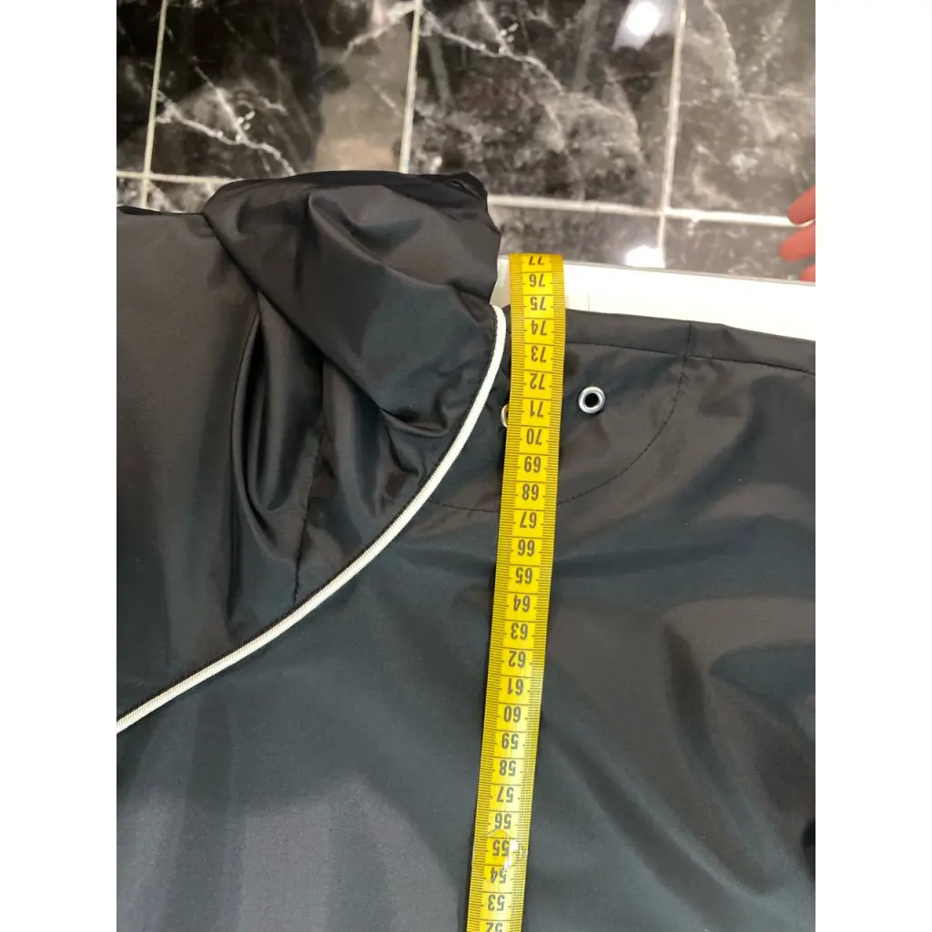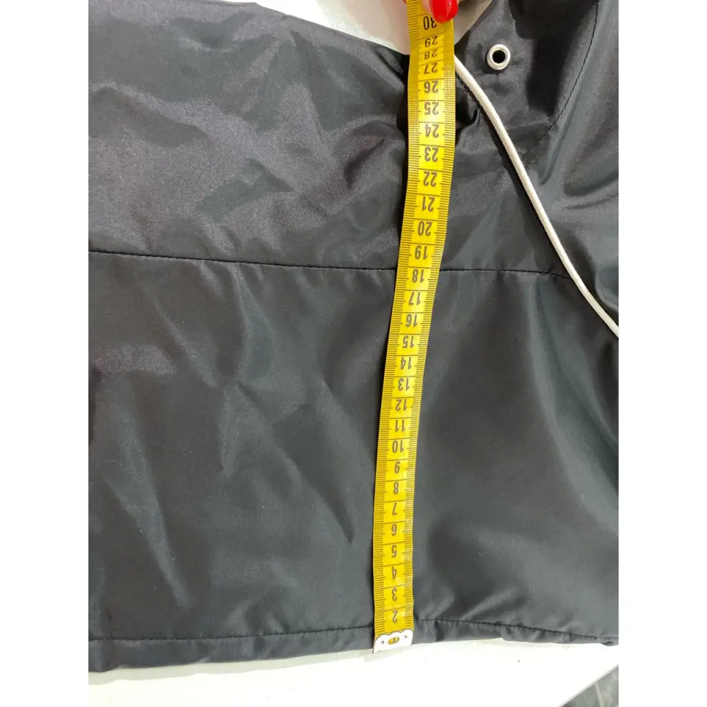 - Черный нейлоновый сатин, капюшон на шнурке, два боковых кармана на молнии, кожаные детали из телячьей кожи.