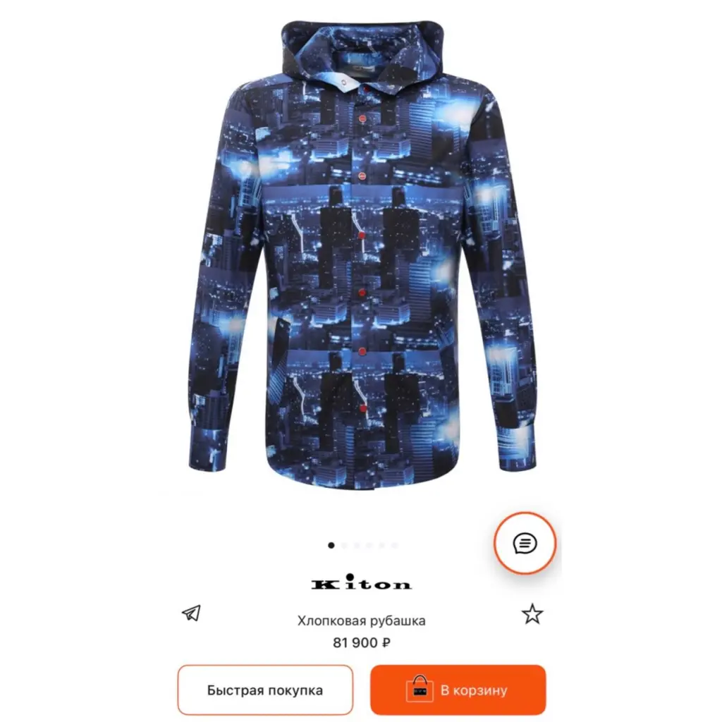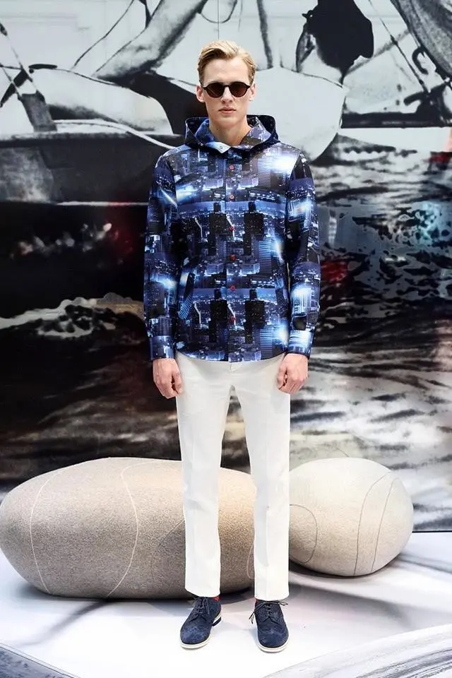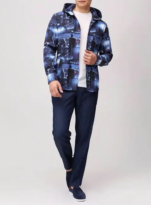 Синяя рубашка из весенне-летней коллекции напоминает ветровку. За сходство отвечает глубокий капюшон. Для пошива модели мастера марки использовали плотный хлопок с крупным фотопринтом, изображающим ночной мегаполис.