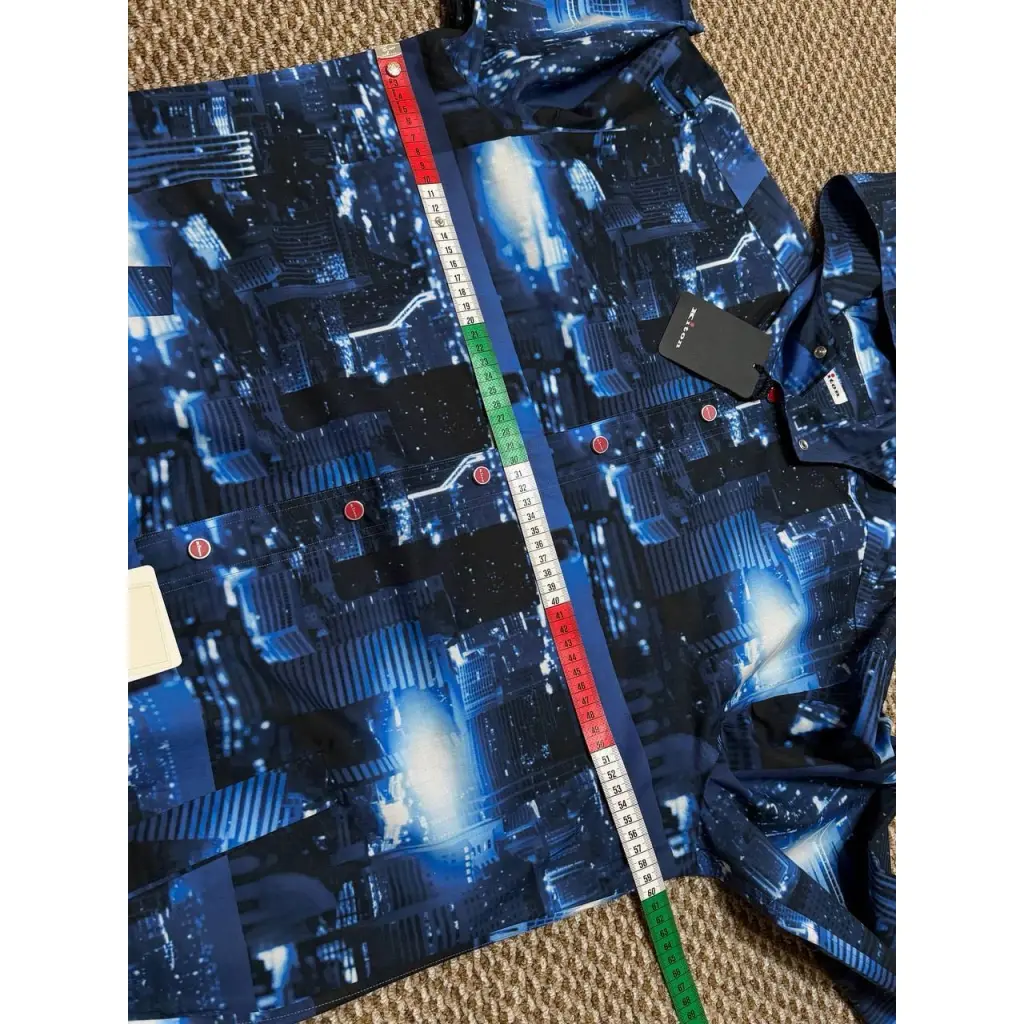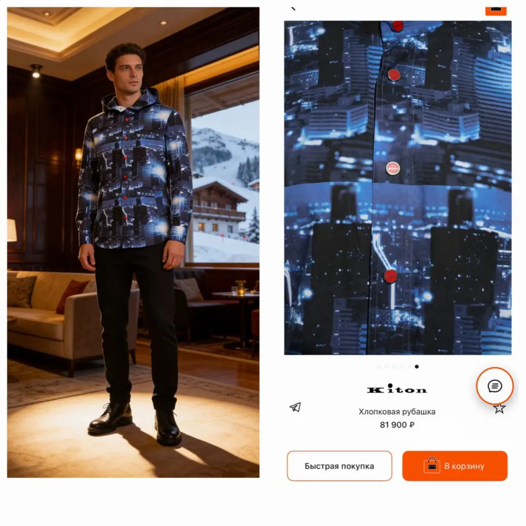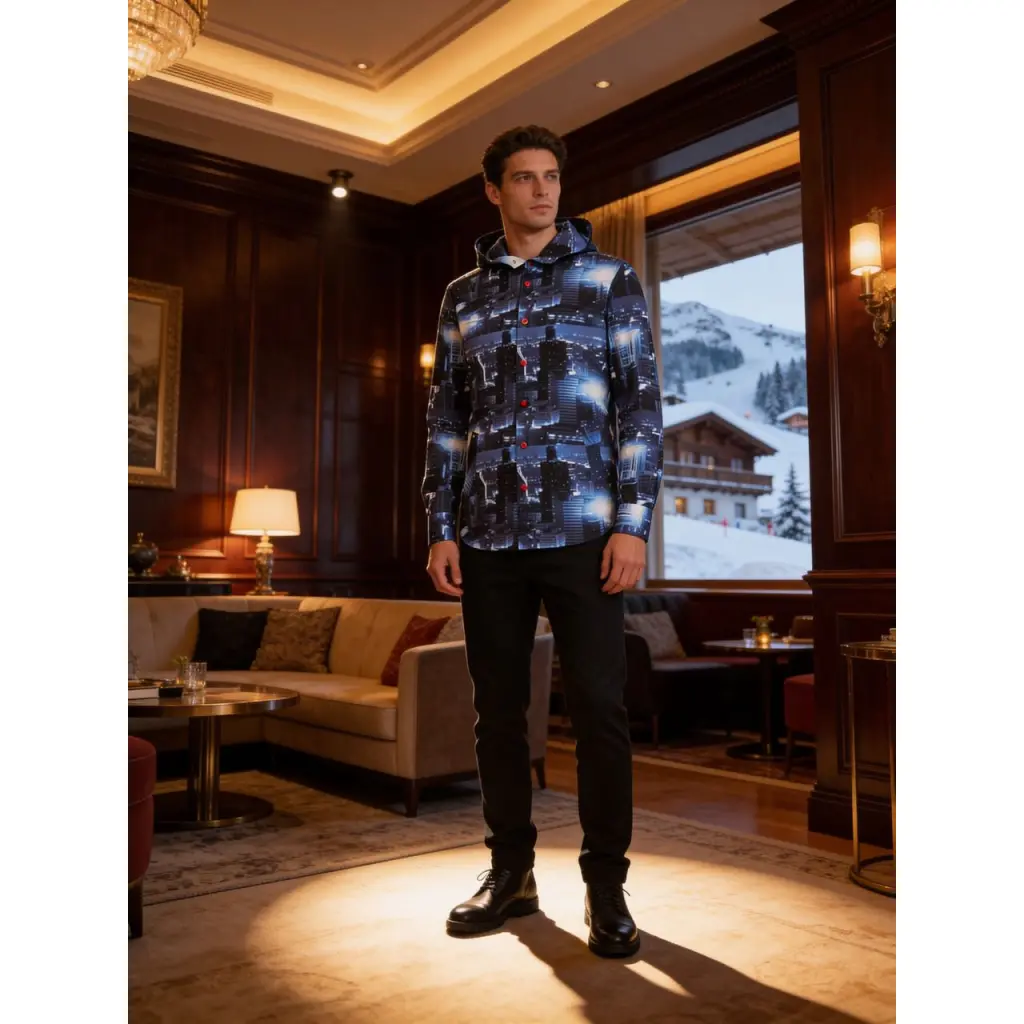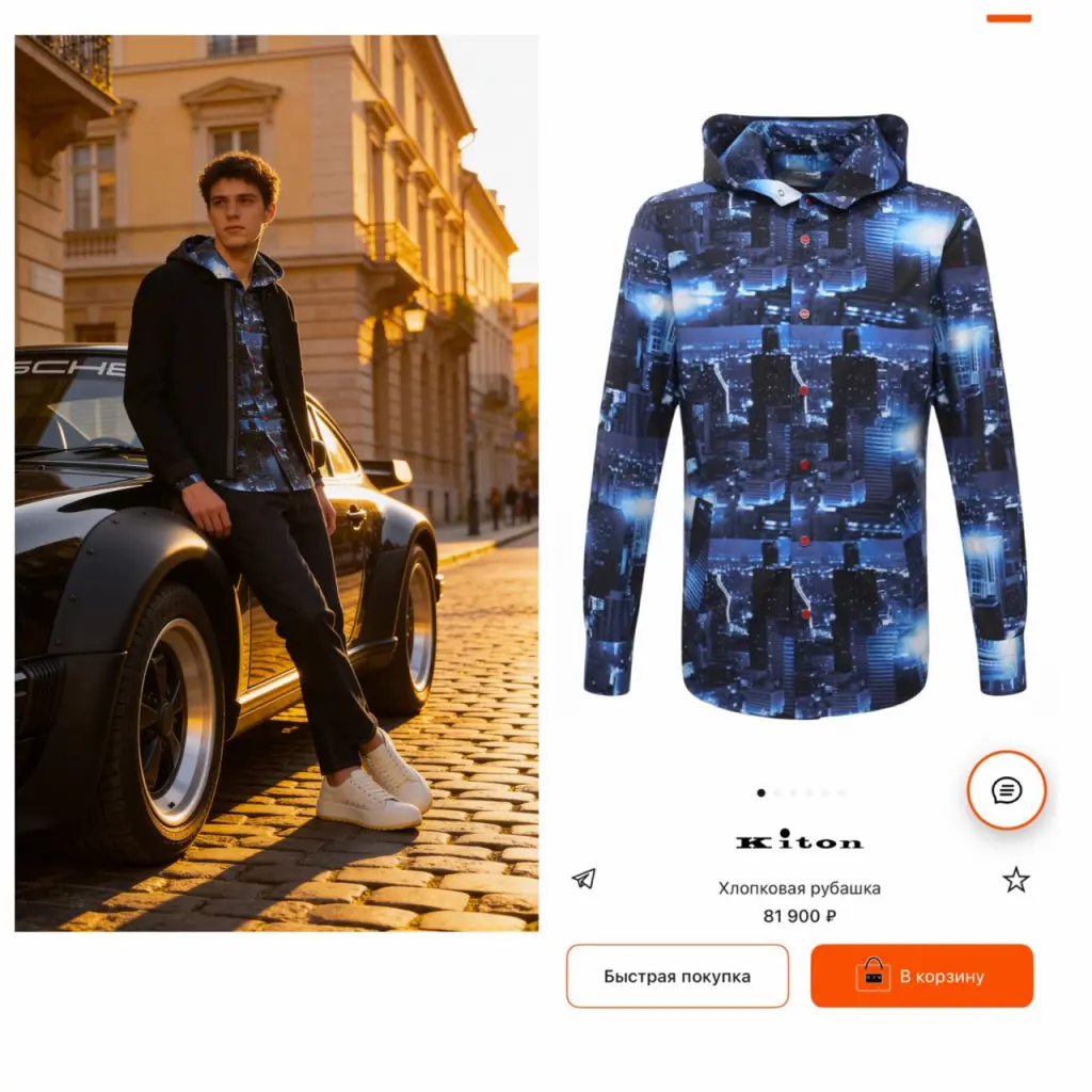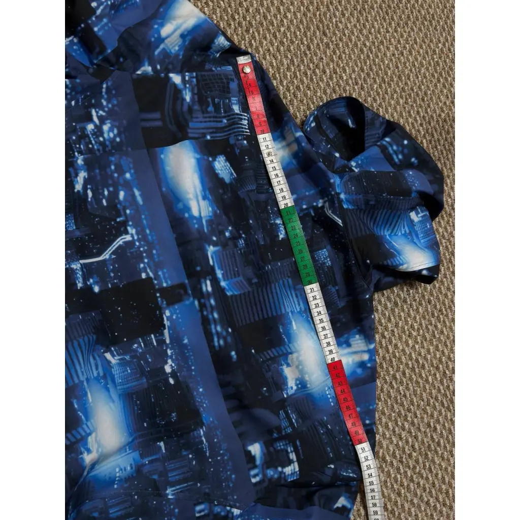 Синяя рубашка из весенне-летней коллекции напоминает ветровку. За сходство отвечает глубокий капюшон. Для пошива модели мастера марки использовали плотный хлопок с крупным фотопринтом, изображающим ночной мегаполис.