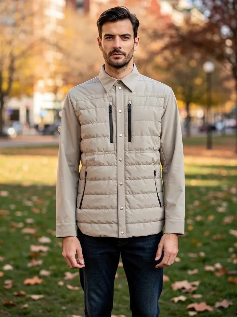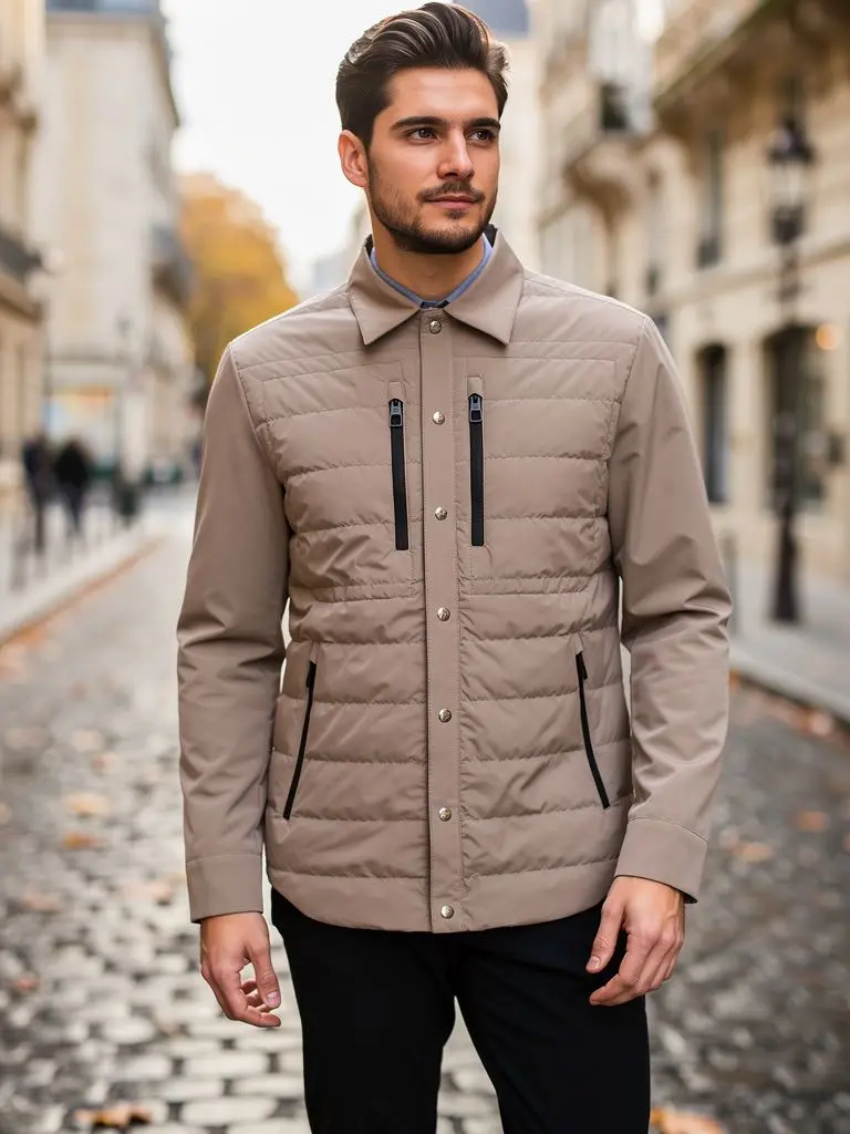 Стеганая бежево-серая куртка с отложным воротником и четырьмя врезными карманами, застегивающимися контрастными молниями, сшита из непромокаемого и непродуваемого текстиля с матовой поверхностью. Очищенная от декора однотонная модель рубашечного кроя утеплена тонким слоем отборного утиного пуха с небольшим добавлением пера,рукава облегченные не утепленные