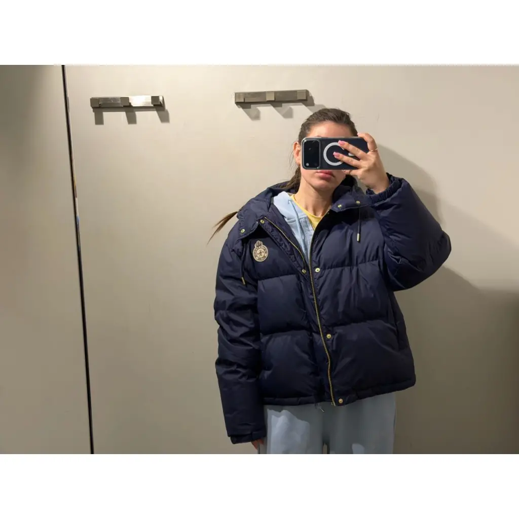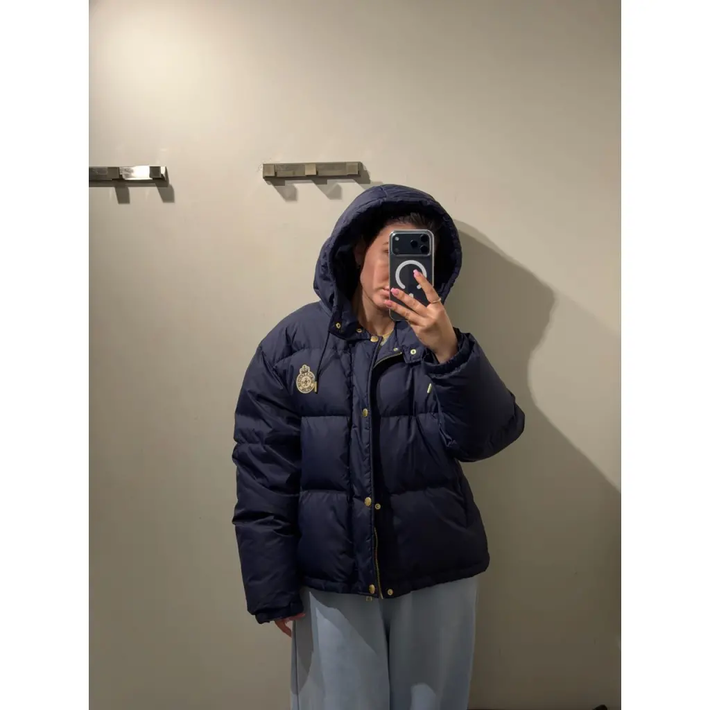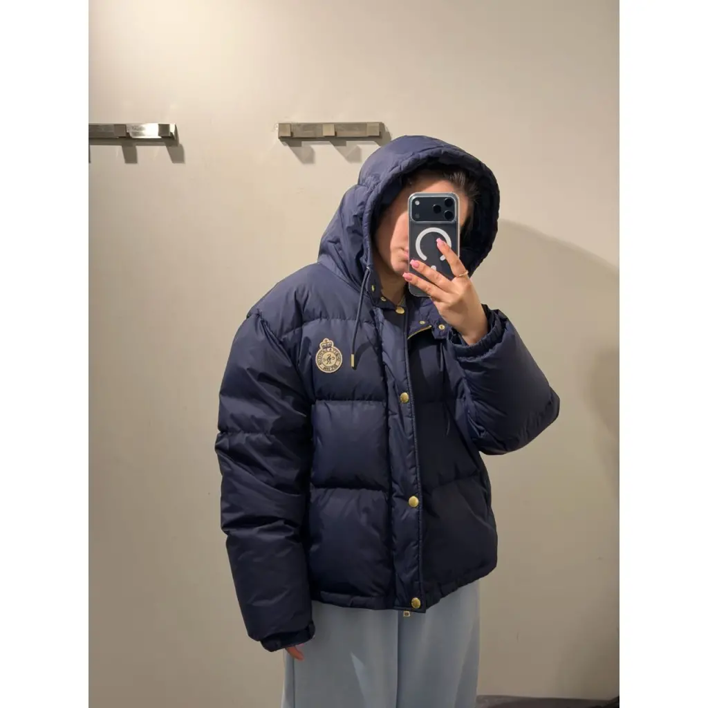 Синий стеганый пуховик от SPORTY&RICH. -Модель прямого кроя с длинными рукавами, узкими манжетами на липучках, прорезными карманами, капюшоном на кулиске, застежкой на молнию, ветрозащитной планкой на кнопках, логотипом бренда на груди. -Благодаря стежке наполнитель равномерно распределен внутри изделия и лучше сохраняет тепло.
