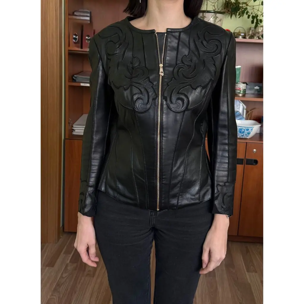 Кожаная куртка. Очень мягкая кожа ягненка Длина по спинке - 50 см, обхват груди - 90 см, обхват талии - 78 см, длина рукава - 51 см.