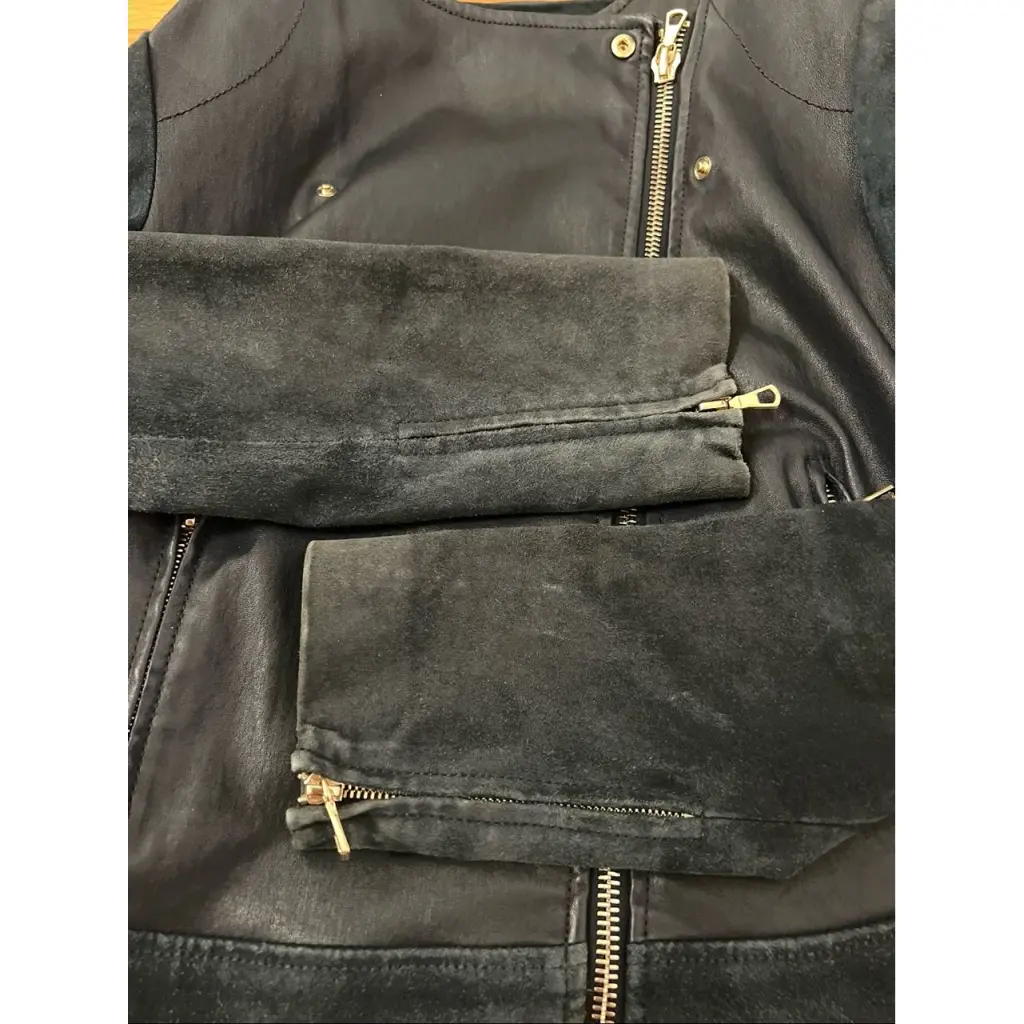 Куртка Yves Salomon глубокого синего цвета с золотой фурнитурой Кожа ягнёнка, замша Длина 55 см Плечи 41 см Пог 45 см Пот 41 см Рукав 62 см В комплекте идут плечики Есть потертости на замше, как естественный результат носки - на фото отражено
