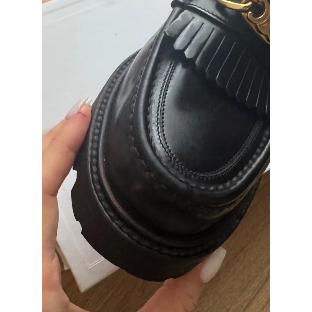 Продаются оригинальные лоферы Celine, размер 39,5 (по у меня 25,6 см. размер ноги, мне как раз). Изготовлены из натуральной кожи. Черный цвет с золотистой фурнитурой. Носила аккуратно, есть небольшая полоса на подошве оранжевого цвета (есть фото), ее не видно при носке, но при желании можно подкрасить; есть естественный залом сбоку - тоже не видно при носке