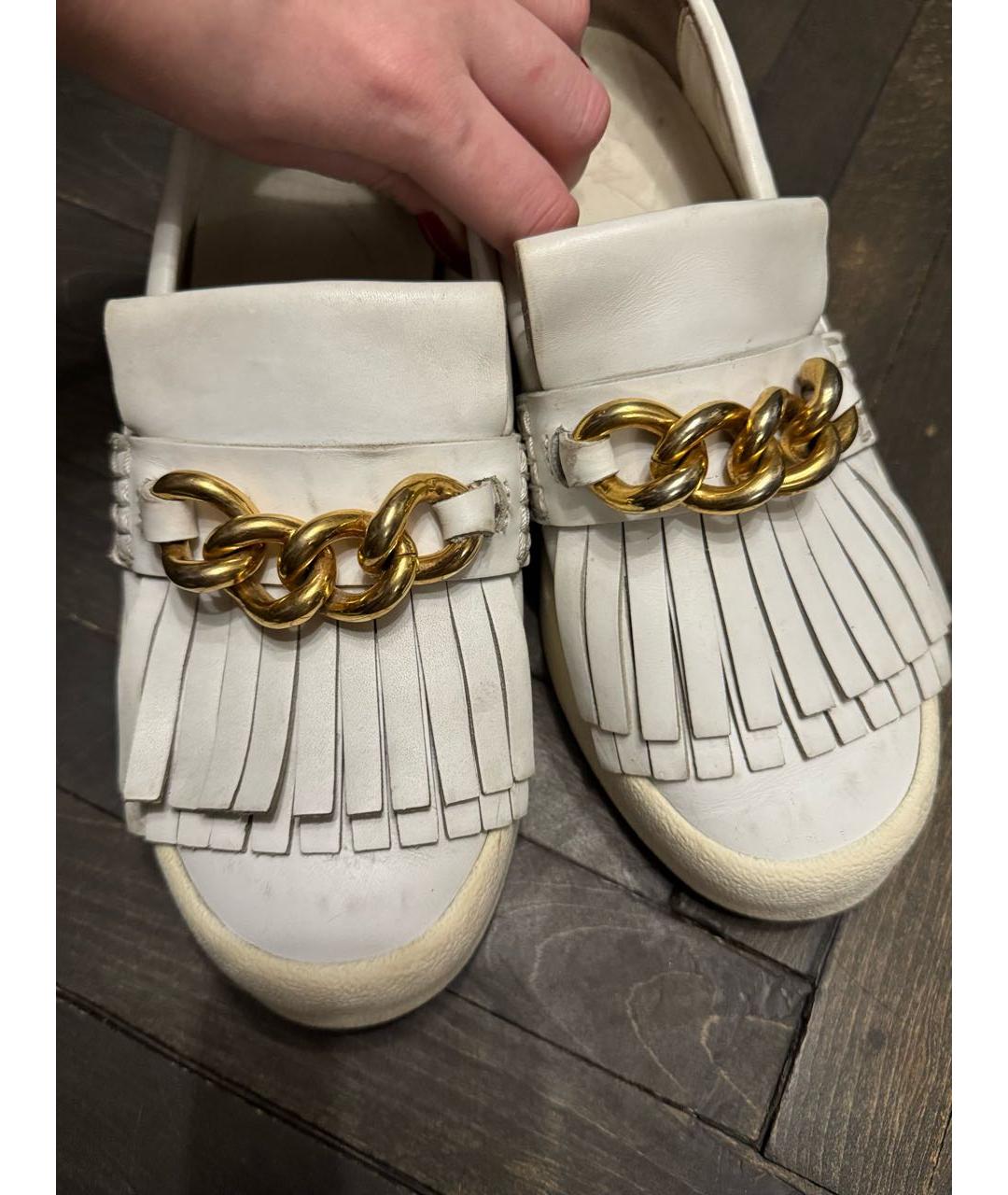 Изготовлены из натуральной кожи белого цвета с золотыми элементами. В хорошем состоянии: носились всего недолго