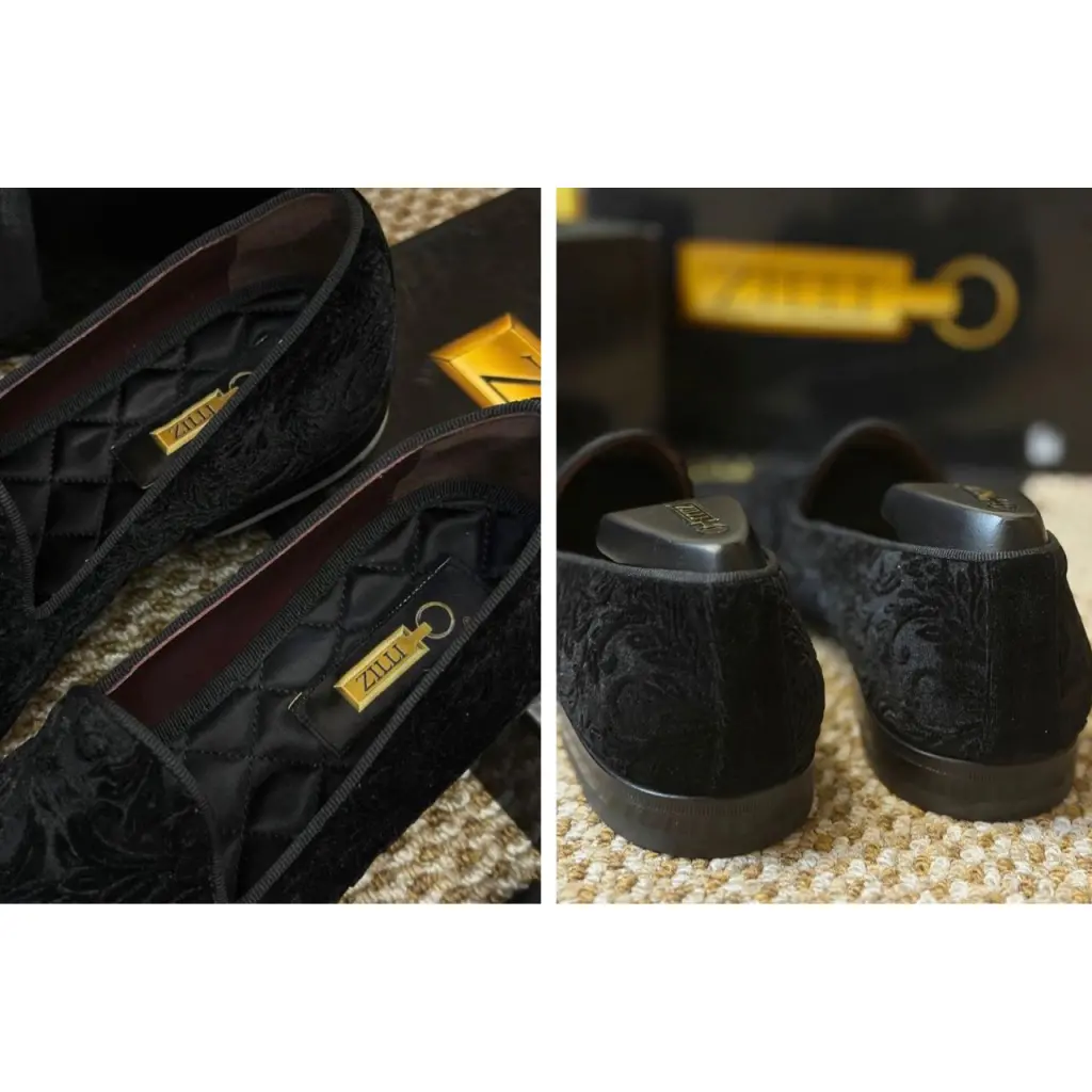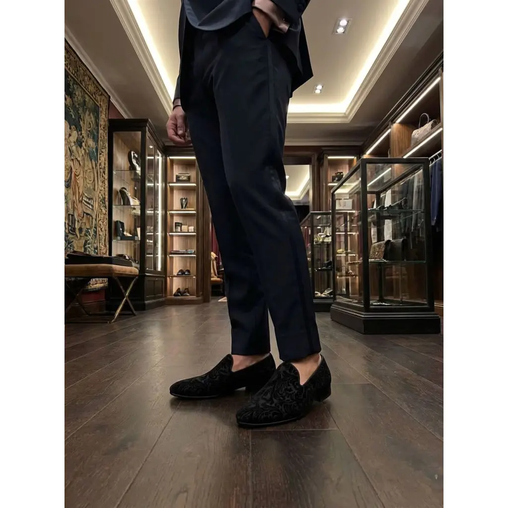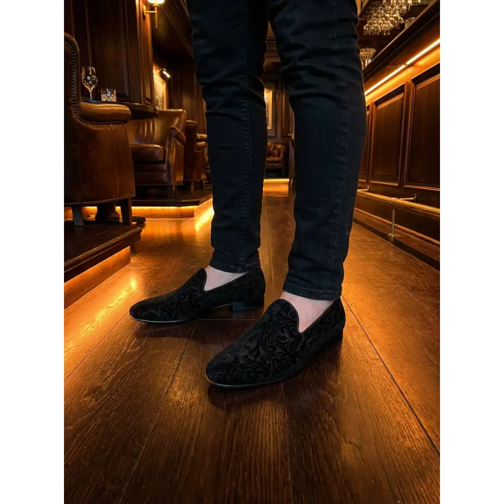 Черные лоферы с миндалевидным мысом вошли в весенне-летнюю коллекцию. Мастера марки изготовили обувь из прочного фактурного текстиля с жаккардовым растительным мотивом. Края фигурного выреза дополнены узким кантом в тон. Такая модель удачно дополнит праздничный или торжественный образ