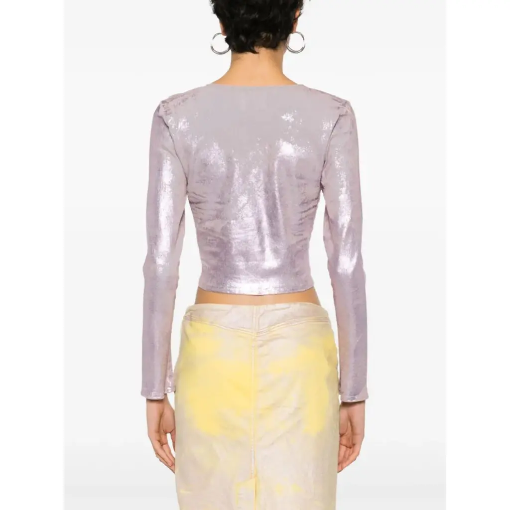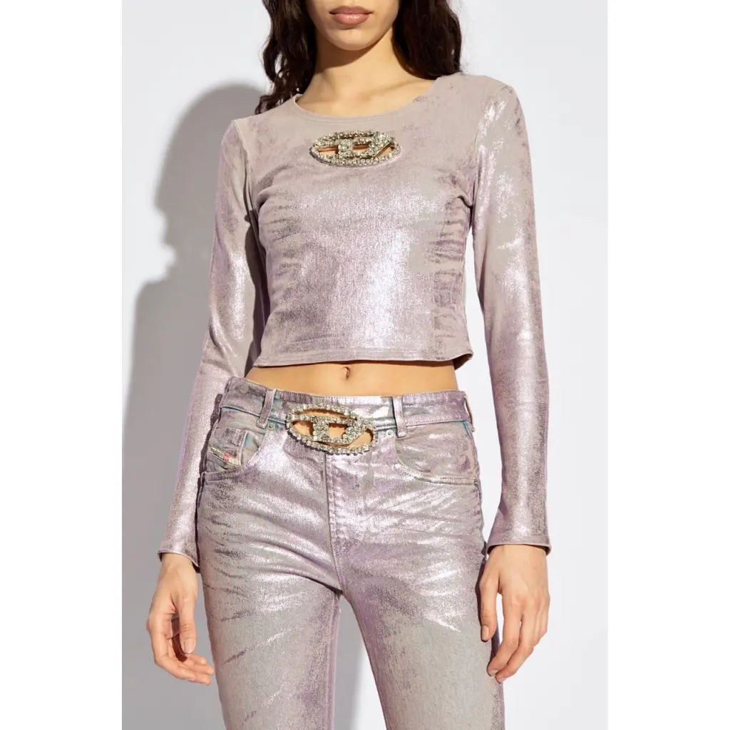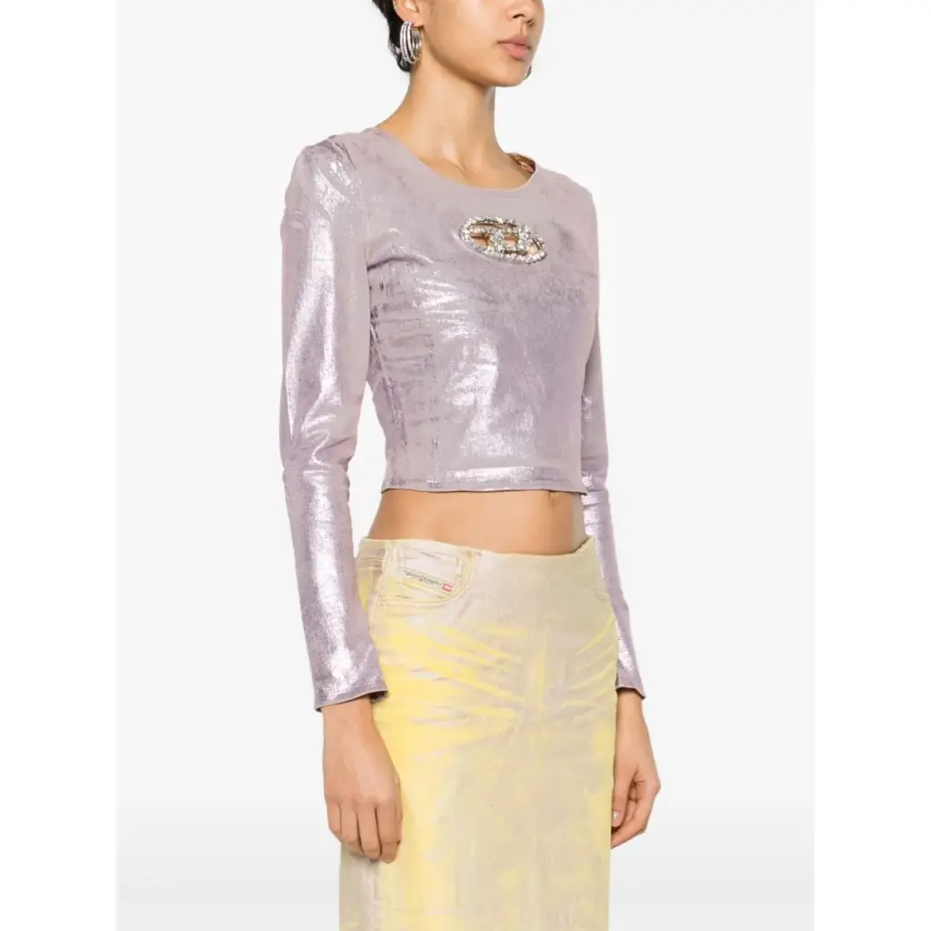 Этот cropped longsleeve топ с длинными рукавами, представленный на показе SS 2024, имеет круглый вырез и посадку второй кожи. Металлический логотип Oval D - полностью покрытый кристаллами для драгоценного поворота - мастерски инкрусирован и детализирован вырезами для тонкого прозрачного эффекта. Эта поп-цветная стирка изготовлена из суперэластичной джинсовой ткани, которая подходит к телу, как вторая кожа, перекрашена и обогащена специальной художественной обработкой, воссоздающей усы и используемые эффекты, где она естественным образом складывается с износом. Мерцающая отделка происходит из листа майларовой фольги, прижатого к ткани, чтобы усилить винтажные эффекты и придать светящуюся отделку.