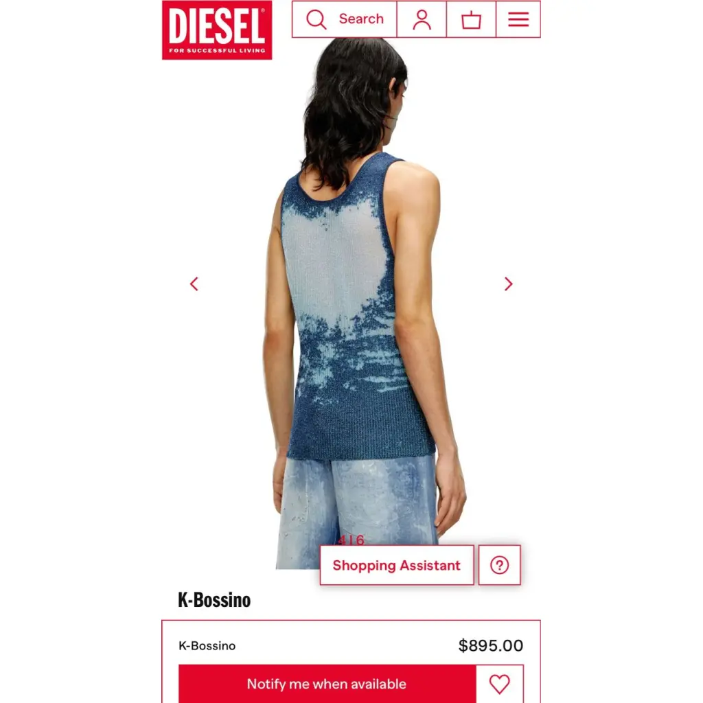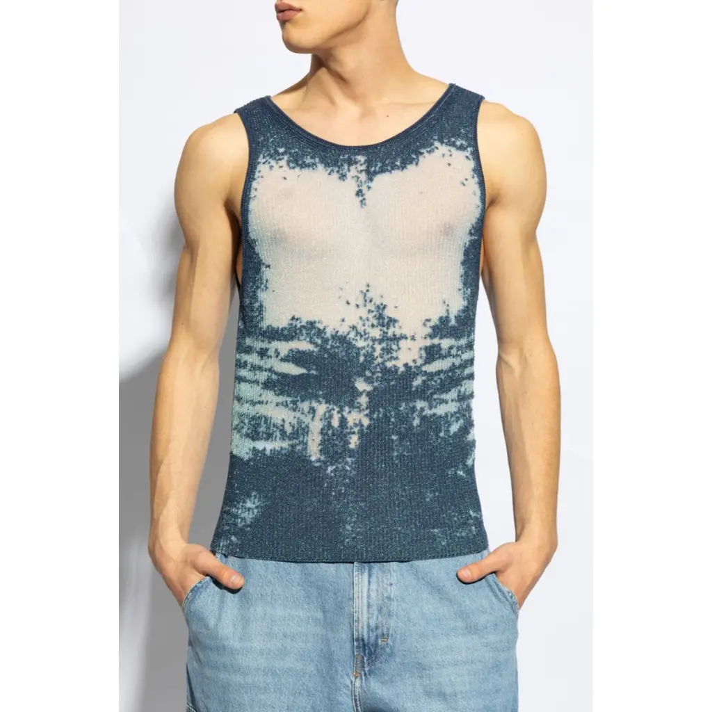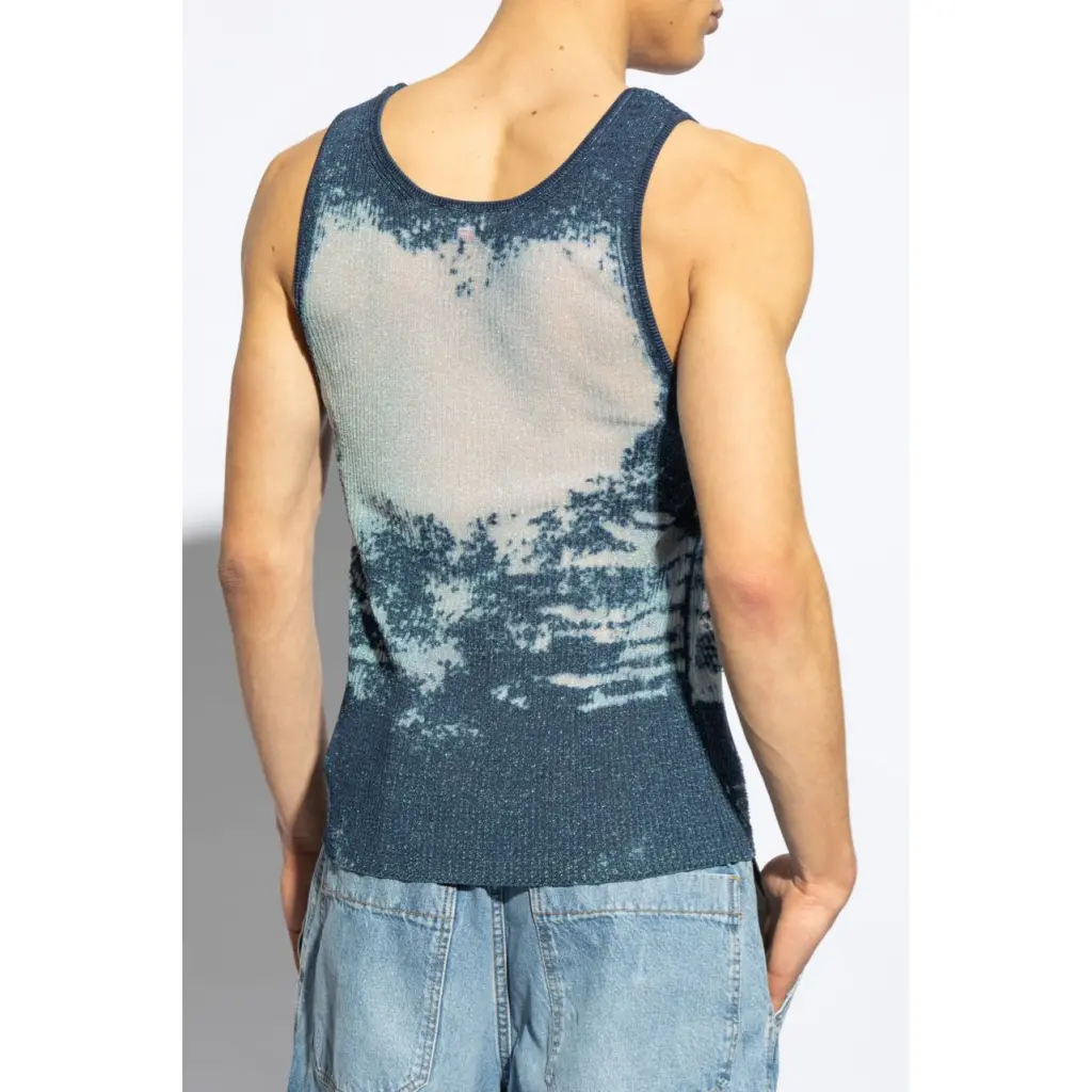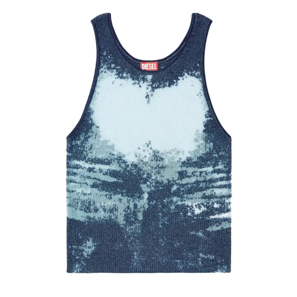 Эксклюзивная вещь Spring '24 Runway Show, эта мужская майка regular fit посадки изготовлена из мерцающего ребристого трикотажа, усыпанного металлической пряжей. Стирка цвета индиго отдает дань уважения джинсовой ткани, в то время как devoré бессистемно разрушает трикотаж до просвязки. Эффект - захватывающий, trompe l'oeil мокрый взгляд, который отражает подрывную этику Diesel.