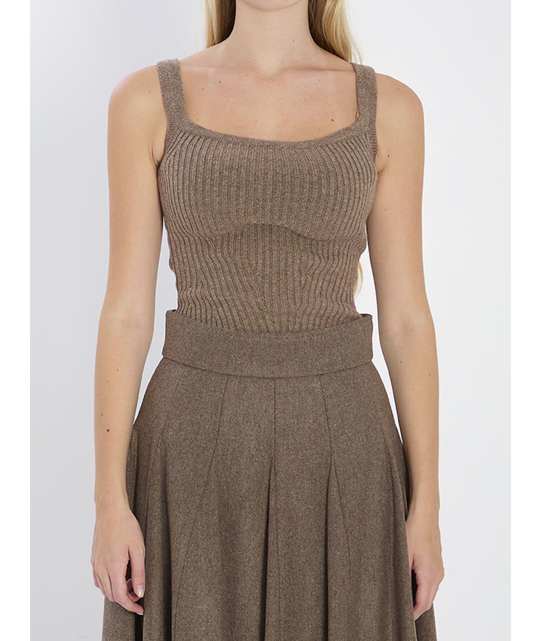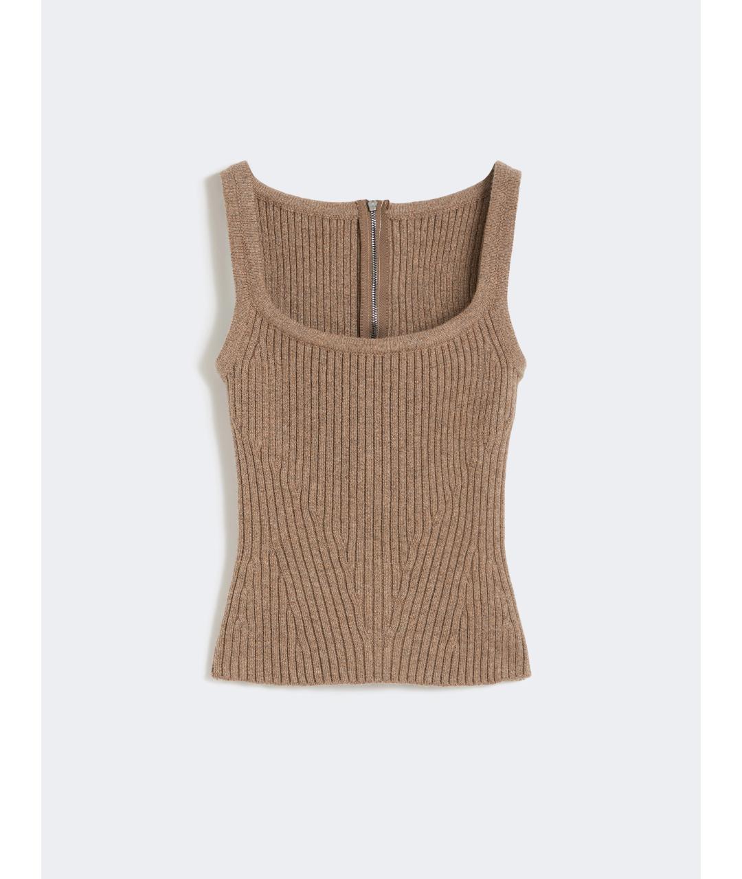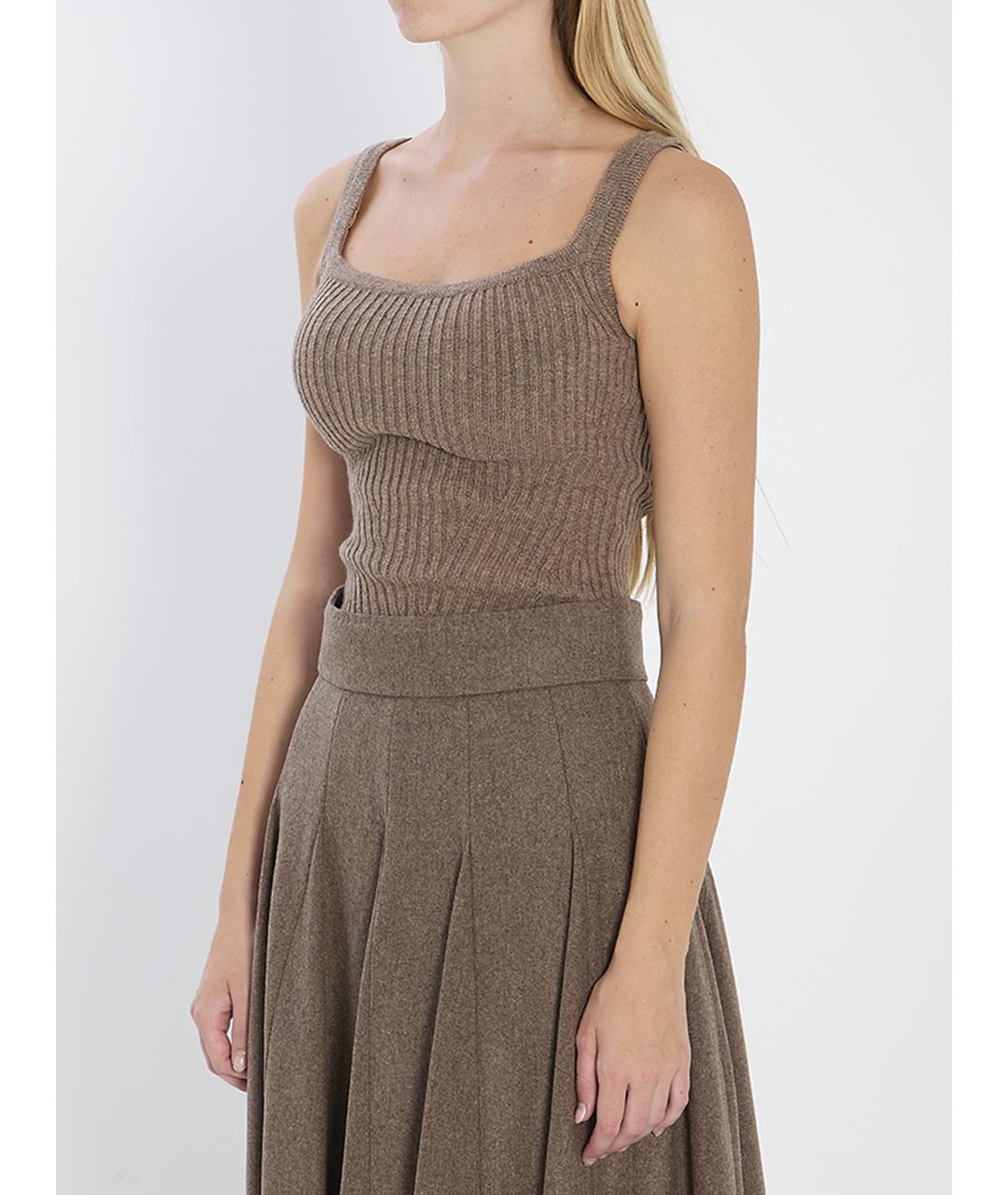 Подписаться Knitted top in wool and cashmere blend in taupe color. Features thin shoulder straps and a back zip closure. Cropped design. Slim fit.The model is 177 cm tall and is wearing size S.Size nationality: INT