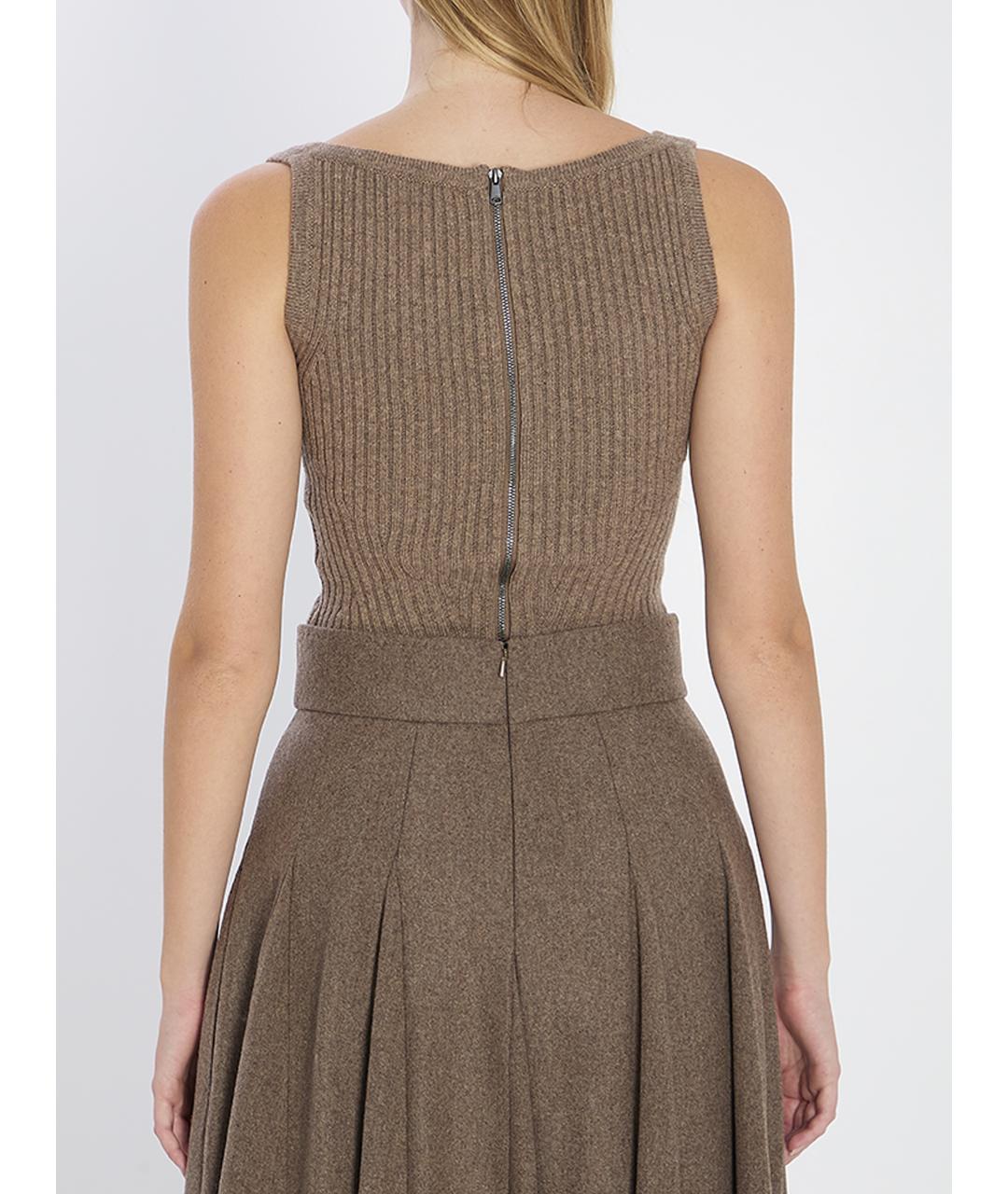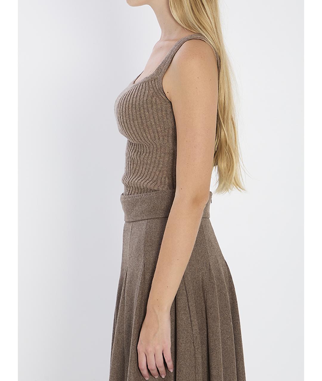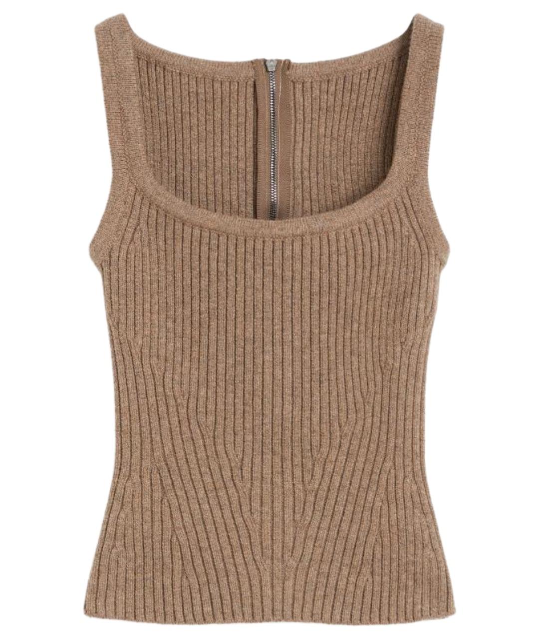 Подписаться Knitted top in wool and cashmere blend in taupe color. Features thin shoulder straps and a back zip closure. Cropped design. Slim fit.The model is 177 cm tall and is wearing size S.Size nationality: INT
